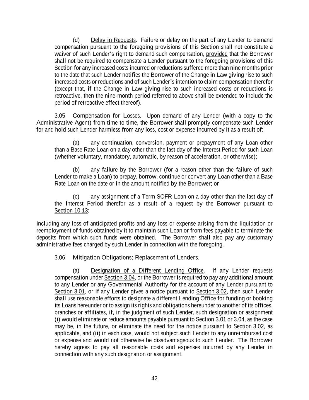 42 (d) Delay in Requests. Failure or delay on the part of any Lender to demand compensation pursuant to the foregoing provisions of this Section shall not constitute a waiver of such Lender’s right to demand such compensation, provided that the Borrower shall not be required to compensate a Lender pursuant to the foregoing provisions of this Section for any increased costs incurred or reductions suffered more than nine months prior to the date that such Lender notifies the Borrower of the Change in Law giving rise to such increased costs or reductions and of such Lender’s intention to claim compensation therefor (except that, if the Change in Law giving rise to such increased costs or reductions is retroactive, then the nine-month period referred to above shall be extended to include the period of retroactive effect thereof). 3.05 Compensation for Losses. Upon demand of any Lender (with a copy to the Administrative Agent) from time to time, the Borrower shall promptly compensate such Lender for and hold such Lender harmless from any loss, cost or expense incurred by it as a result of: (a) any continuation, conversion, payment or prepayment of any Loan other than a Base Rate Loan on a day other than the last day of the Interest Period for such Loan (whether voluntary, mandatory, automatic, by reason of acceleration, or otherwise); (b) any failure by the Borrower (for a reason other than the failure of such Lender to make a Loan) to prepay, borrow, continue or convert any Loan other than a Base Rate Loan on the date or in the amount notified by the Borrower; or (c) any assignment of a Term SOFR Loan on a day other than the last day of the Interest Period therefor as a result of a request by the Borrower pursuant to Section 10.13; including any loss of anticipated profits and any loss or expense arising from the liquidation or reemployment of funds obtained by it to maintain such Loan or from fees payable to terminate the deposits from which such funds were obtained. The Borrower shall also pay any customary administrative fees charged by such Lender in connection with the foregoing. 3.06 Mitigation Obligations; Replacement of Lenders. (a) Designation of a Different Lending Office. If any Lender requests compensation under Section 3.04, or the Borrower is required to pay any additional amount to any Lender or any Governmental Authority for the account of any Lender pursuant to Section 3.01, or if any Lender gives a notice pursuant to Section 3.02, then such Lender shall use reasonable efforts to designate a different Lending Office for funding or booking its Loans hereunder or to assign its rights and obligations hereunder to another of its offices, branches or affiliates, if, in the judgment of such Lender, such designation or assignment (i) would eliminate or reduce amounts payable pursuant to Section 3.01 or 3.04, as the case may be, in the future, or eliminate the need for the notice pursuant to Section 3.02, as applicable, and (ii) in each case, would not subject such Lender to any unreimbursed cost or expense and would not otherwise be disadvantageous to such Lender. The Borrower hereby agrees to pay all reasonable costs and expenses incurred by any Lender in connection with any such designation or assignment.
