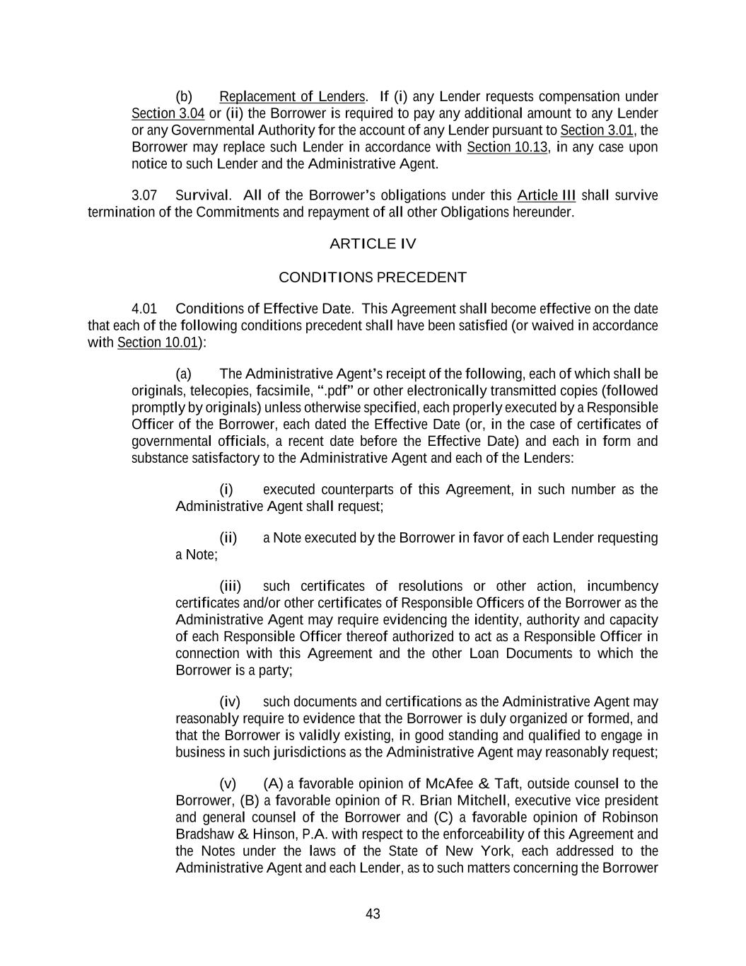 43 (b) Replacement of Lenders. If (i) any Lender requests compensation under Section 3.04 or (ii) the Borrower is required to pay any additional amount to any Lender or any Governmental Authority for the account of any Lender pursuant to Section 3.01, the Borrower may replace such Lender in accordance with Section 10.13, in any case upon notice to such Lender and the Administrative Agent. 3.07 Survival. All of the Borrower’s obligations under this Article III shall survive termination of the Commitments and repayment of all other Obligations hereunder. ARTICLE IV CONDITIONS PRECEDENT 4.01 Conditions of Effective Date. This Agreement shall become effective on the date that each of the following conditions precedent shall have been satisfied (or waived in accordance with Section 10.01): (a) The Administrative Agent’s receipt of the following, each of which shall be originals, telecopies, facsimile, “.pdf” or other electronically transmitted copies (followed promptly by originals) unless otherwise specified, each properly executed by a Responsible Officer of the Borrower, each dated the Effective Date (or, in the case of certificates of governmental officials, a recent date before the Effective Date) and each in form and substance satisfactory to the Administrative Agent and each of the Lenders: (i) executed counterparts of this Agreement, in such number as the Administrative Agent shall request; (ii) a Note executed by the Borrower in favor of each Lender requesting a Note; (iii) such certificates of resolutions or other action, incumbency certificates and/or other certificates of Responsible Officers of the Borrower as the Administrative Agent may require evidencing the identity, authority and capacity of each Responsible Officer thereof authorized to act as a Responsible Officer in connection with this Agreement and the other Loan Documents to which the Borrower is a party; (iv) such documents and certifications as the Administrative Agent may reasonably require to evidence that the Borrower is duly organized or formed, and that the Borrower is validly existing, in good standing and qualified to engage in business in such jurisdictions as the Administrative Agent may reasonably request; (v) (A) a favorable opinion of McAfee & Taft, outside counsel to the Borrower, (B) a favorable opinion of R. Brian Mitchell, executive vice president and general counsel of the Borrower and (C) a favorable opinion of Robinson Bradshaw & Hinson, P.A. with respect to the enforceability of this Agreement and the Notes under the laws of the State of New York, each addressed to the Administrative Agent and each Lender, as to such matters concerning the Borrower
