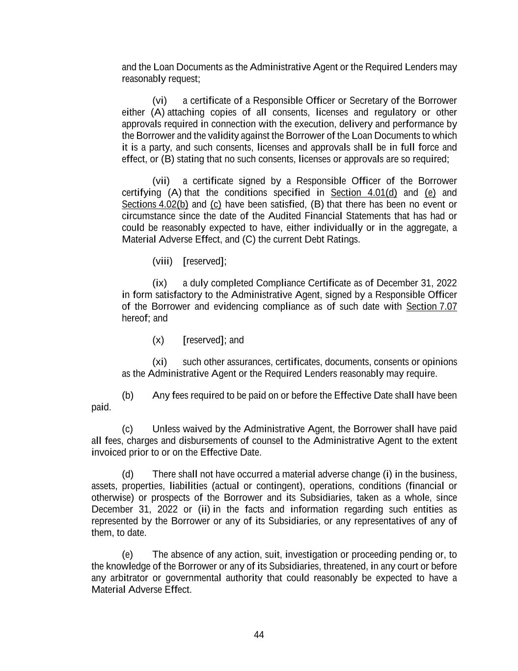 44 and the Loan Documents as the Administrative Agent or the Required Lenders may reasonably request; (vi) a certificate of a Responsible Officer or Secretary of the Borrower either (A) attaching copies of all consents, licenses and regulatory or other approvals required in connection with the execution, delivery and performance by the Borrower and the validity against the Borrower of the Loan Documents to which it is a party, and such consents, licenses and approvals shall be in full force and effect, or (B) stating that no such consents, licenses or approvals are so required; (vii) a certificate signed by a Responsible Officer of the Borrower certifying (A) that the conditions specified in Section 4.01(d) and (e) and Sections 4.02(b) and (c) have been satisfied, (B) that there has been no event or circumstance since the date of the Audited Financial Statements that has had or could be reasonably expected to have, either individually or in the aggregate, a Material Adverse Effect, and (C) the current Debt Ratings. (viii) [reserved]; (ix) a duly completed Compliance Certificate as of December 31, 2022 in form satisfactory to the Administrative Agent, signed by a Responsible Officer of the Borrower and evidencing compliance as of such date with Section 7.07 hereof; and (x) [reserved]; and (xi) such other assurances, certificates, documents, consents or opinions as the Administrative Agent or the Required Lenders reasonably may require. (b) Any fees required to be paid on or before the Effective Date shall have been paid. (c) Unless waived by the Administrative Agent, the Borrower shall have paid all fees, charges and disbursements of counsel to the Administrative Agent to the extent invoiced prior to or on the Effective Date. (d) There shall not have occurred a material adverse change (i) in the business, assets, properties, liabilities (actual or contingent), operations, conditions (financial or otherwise) or prospects of the Borrower and its Subsidiaries, taken as a whole, since December 31, 2022 or (ii) in the facts and information regarding such entities as represented by the Borrower or any of its Subsidiaries, or any representatives of any of them, to date. (e) The absence of any action, suit, investigation or proceeding pending or, to the knowledge of the Borrower or any of its Subsidiaries, threatened, in any court or before any arbitrator or governmental authority that could reasonably be expected to have a Material Adverse Effect.