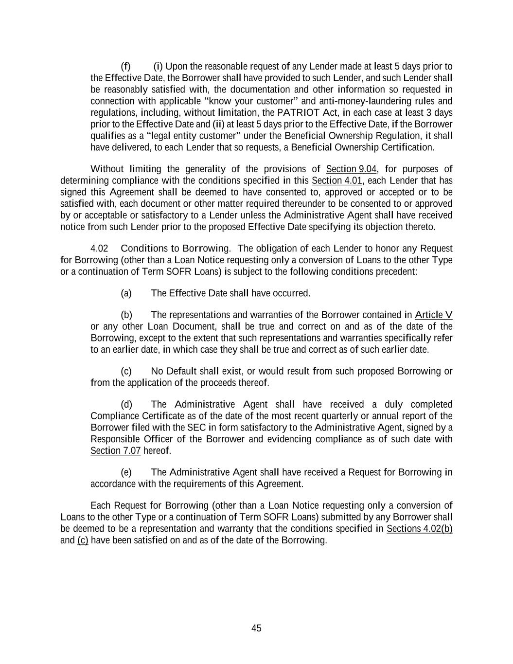 45 (f) (i) Upon the reasonable request of any Lender made at least 5 days prior to the Effective Date, the Borrower shall have provided to such Lender, and such Lender shall be reasonably satisfied with, the documentation and other information so requested in connection with applicable “know your customer” and anti-money-laundering rules and regulations, including, without limitation, the PATRIOT Act, in each case at least 3 days prior to the Effective Date and (ii) at least 5 days prior to the Effective Date, if the Borrower qualifies as a “legal entity customer” under the Beneficial Ownership Regulation, it shall have delivered, to each Lender that so requests, a Beneficial Ownership Certification. Without limiting the generality of the provisions of Section 9.04, for purposes of determining compliance with the conditions specified in this Section 4.01, each Lender that has signed this Agreement shall be deemed to have consented to, approved or accepted or to be satisfied with, each document or other matter required thereunder to be consented to or approved by or acceptable or satisfactory to a Lender unless the Administrative Agent shall have received notice from such Lender prior to the proposed Effective Date specifying its objection thereto. 4.02 Conditions to Borrowing. The obligation of each Lender to honor any Request for Borrowing (other than a Loan Notice requesting only a conversion of Loans to the other Type or a continuation of Term SOFR Loans) is subject to the following conditions precedent: (a) The Effective Date shall have occurred. (b) The representations and warranties of the Borrower contained in Article V or any other Loan Document, shall be true and correct on and as of the date of the Borrowing, except to the extent that such representations and warranties specifically refer to an earlier date, in which case they shall be true and correct as of such earlier date. (c) No Default shall exist, or would result from such proposed Borrowing or from the application of the proceeds thereof. (d) The Administrative Agent shall have received a duly completed Compliance Certificate as of the date of the most recent quarterly or annual report of the Borrower filed with the SEC in form satisfactory to the Administrative Agent, signed by a Responsible Officer of the Borrower and evidencing compliance as of such date with Section 7.07 hereof. (e) The Administrative Agent shall have received a Request for Borrowing in accordance with the requirements of this Agreement. Each Request for Borrowing (other than a Loan Notice requesting only a conversion of Loans to the other Type or a continuation of Term SOFR Loans) submitted by any Borrower shall be deemed to be a representation and warranty that the conditions specified in Sections 4.02(b) and (c) have been satisfied on and as of the date of the Borrowing.