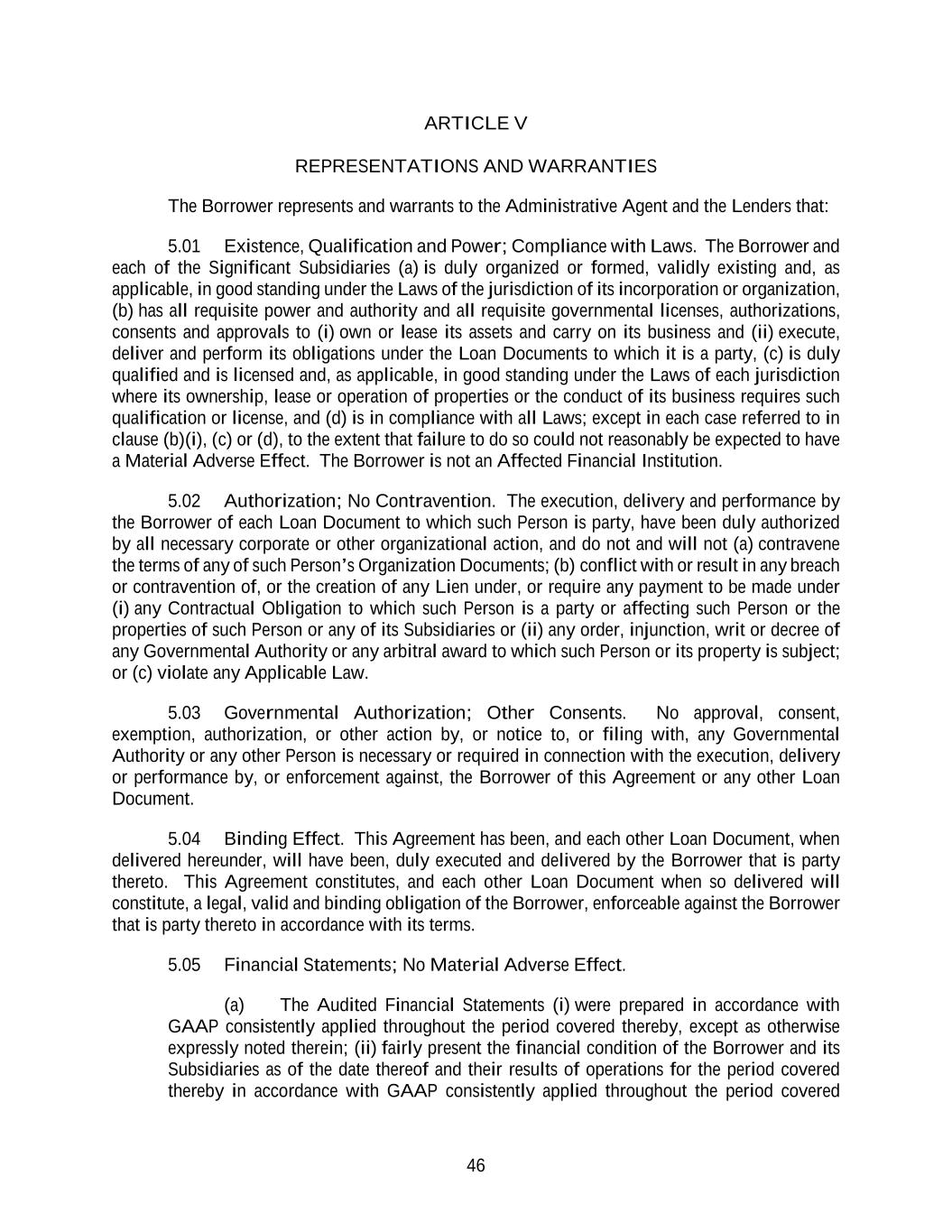 46 ARTICLE V REPRESENTATIONS AND WARRANTIES The Borrower represents and warrants to the Administrative Agent and the Lenders that: 5.01 Existence, Qualification and Power; Compliance with Laws. The Borrower and each of the Significant Subsidiaries (a) is duly organized or formed, validly existing and, as applicable, in good standing under the Laws of the jurisdiction of its incorporation or organization, (b) has all requisite power and authority and all requisite governmental licenses, authorizations, consents and approvals to (i) own or lease its assets and carry on its business and (ii) execute, deliver and perform its obligations under the Loan Documents to which it is a party, (c) is duly qualified and is licensed and, as applicable, in good standing under the Laws of each jurisdiction where its ownership, lease or operation of properties or the conduct of its business requires such qualification or license, and (d) is in compliance with all Laws; except in each case referred to in clause (b)(i), (c) or (d), to the extent that failure to do so could not reasonably be expected to have a Material Adverse Effect. The Borrower is not an Affected Financial Institution. 5.02 Authorization; No Contravention. The execution, delivery and performance by the Borrower of each Loan Document to which such Person is party, have been duly authorized by all necessary corporate or other organizational action, and do not and will not (a) contravene the terms of any of such Person’s Organization Documents; (b) conflict with or result in any breach or contravention of, or the creation of any Lien under, or require any payment to be made under (i) any Contractual Obligation to which such Person is a party or affecting such Person or the properties of such Person or any of its Subsidiaries or (ii) any order, injunction, writ or decree of any Governmental Authority or any arbitral award to which such Person or its property is subject; or (c) violate any Applicable Law. 5.03 Governmental Authorization; Other Consents. No approval, consent, exemption, authorization, or other action by, or notice to, or filing with, any Governmental Authority or any other Person is necessary or required in connection with the execution, delivery or performance by, or enforcement against, the Borrower of this Agreement or any other Loan Document. 5.04 Binding Effect. This Agreement has been, and each other Loan Document, when delivered hereunder, will have been, duly executed and delivered by the Borrower that is party thereto. This Agreement constitutes, and each other Loan Document when so delivered will constitute, a legal, valid and binding obligation of the Borrower, enforceable against the Borrower that is party thereto in accordance with its terms. 5.05 Financial Statements; No Material Adverse Effect. (a) The Audited Financial Statements (i) were prepared in accordance with GAAP consistently applied throughout the period covered thereby, except as otherwise expressly noted therein; (ii) fairly present the financial condition of the Borrower and its Subsidiaries as of the date thereof and their results of operations for the period covered thereby in accordance with GAAP consistently applied throughout the period covered