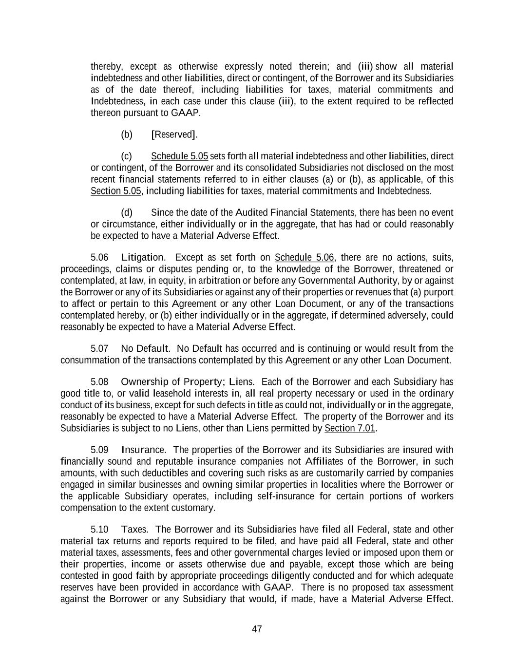 47 thereby, except as otherwise expressly noted therein; and (iii) show all material indebtedness and other liabilities, direct or contingent, of the Borrower and its Subsidiaries as of the date thereof, including liabilities for taxes, material commitments and Indebtedness, in each case under this clause (iii), to the extent required to be reflected thereon pursuant to GAAP. (b) [Reserved]. (c) Schedule 5.05 sets forth all material indebtedness and other liabilities, direct or contingent, of the Borrower and its consolidated Subsidiaries not disclosed on the most recent financial statements referred to in either clauses (a) or (b), as applicable, of this Section 5.05, including liabilities for taxes, material commitments and Indebtedness. (d) Since the date of the Audited Financial Statements, there has been no event or circumstance, either individually or in the aggregate, that has had or could reasonably be expected to have a Material Adverse Effect. 5.06 Litigation. Except as set forth on Schedule 5.06, there are no actions, suits, proceedings, claims or disputes pending or, to the knowledge of the Borrower, threatened or contemplated, at law, in equity, in arbitration or before any Governmental Authority, by or against the Borrower or any of its Subsidiaries or against any of their properties or revenues that (a) purport to affect or pertain to this Agreement or any other Loan Document, or any of the transactions contemplated hereby, or (b) either individually or in the aggregate, if determined adversely, could reasonably be expected to have a Material Adverse Effect. 5.07 No Default. No Default has occurred and is continuing or would result from the consummation of the transactions contemplated by this Agreement or any other Loan Document. 5.08 Ownership of Property; Liens. Each of the Borrower and each Subsidiary has good title to, or valid leasehold interests in, all real property necessary or used in the ordinary conduct of its business, except for such defects in title as could not, individually or in the aggregate, reasonably be expected to have a Material Adverse Effect. The property of the Borrower and its Subsidiaries is subject to no Liens, other than Liens permitted by Section 7.01. 5.09 Insurance. The properties of the Borrower and its Subsidiaries are insured with financially sound and reputable insurance companies not Affiliates of the Borrower, in such amounts, with such deductibles and covering such risks as are customarily carried by companies engaged in similar businesses and owning similar properties in localities where the Borrower or the applicable Subsidiary operates, including self-insurance for certain portions of workers compensation to the extent customary. 5.10 Taxes. The Borrower and its Subsidiaries have filed all Federal, state and other material tax returns and reports required to be filed, and have paid all Federal, state and other material taxes, assessments, fees and other governmental charges levied or imposed upon them or their properties, income or assets otherwise due and payable, except those which are being contested in good faith by appropriate proceedings diligently conducted and for which adequate reserves have been provided in accordance with GAAP. There is no proposed tax assessment against the Borrower or any Subsidiary that would, if made, have a Material Adverse Effect.