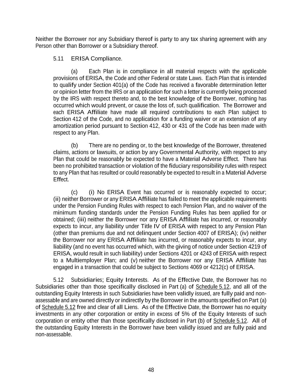 48 Neither the Borrower nor any Subsidiary thereof is party to any tax sharing agreement with any Person other than Borrower or a Subsidiary thereof. 5.11 ERISA Compliance. (a) Each Plan is in compliance in all material respects with the applicable provisions of ERISA, the Code and other Federal or state Laws. Each Plan that is intended to qualify under Section 401(a) of the Code has received a favorable determination letter or opinion letter from the IRS or an application for such a letter is currently being processed by the IRS with respect thereto and, to the best knowledge of the Borrower, nothing has occurred which would prevent, or cause the loss of, such qualification. The Borrower and each ERISA Affiliate have made all required contributions to each Plan subject to Section 412 of the Code, and no application for a funding waiver or an extension of any amortization period pursuant to Section 412, 430 or 431 of the Code has been made with respect to any Plan. (b) There are no pending or, to the best knowledge of the Borrower, threatened claims, actions or lawsuits, or action by any Governmental Authority, with respect to any Plan that could be reasonably be expected to have a Material Adverse Effect. There has been no prohibited transaction or violation of the fiduciary responsibility rules with respect to any Plan that has resulted or could reasonably be expected to result in a Material Adverse Effect. (c) (i) No ERISA Event has occurred or is reasonably expected to occur; (ii) neither Borrower or any ERISA Affiliate has failed to meet the applicable requirements under the Pension Funding Rules with respect to each Pension Plan, and no waiver of the minimum funding standards under the Pension Funding Rules has been applied for or obtained; (iii) neither the Borrower nor any ERISA Affiliate has incurred, or reasonably expects to incur, any liability under Title IV of ERISA with respect to any Pension Plan (other than premiums due and not delinquent under Section 4007 of ERISA); (iv) neither the Borrower nor any ERISA Affiliate has incurred, or reasonably expects to incur, any liability (and no event has occurred which, with the giving of notice under Section 4219 of ERISA, would result in such liability) under Sections 4201 or 4243 of ERISA with respect to a Multiemployer Plan; and (v) neither the Borrower nor any ERISA Affiliate has engaged in a transaction that could be subject to Sections 4069 or 4212(c) of ERISA. 5.12 Subsidiaries; Equity Interests. As of the Effective Date, the Borrower has no Subsidiaries other than those specifically disclosed in Part (a) of Schedule 5.12, and all of the outstanding Equity Interests in such Subsidiaries have been validly issued, are fully paid and non- assessable and are owned directly or indirectly by the Borrower in the amounts specified on Part (a) of Schedule 5.12 free and clear of all Liens. As of the Effective Date, the Borrower has no equity investments in any other corporation or entity in excess of 5% of the Equity Interests of such corporation or entity other than those specifically disclosed in Part (b) of Schedule 5.12. All of the outstanding Equity Interests in the Borrower have been validly issued and are fully paid and non-assessable.