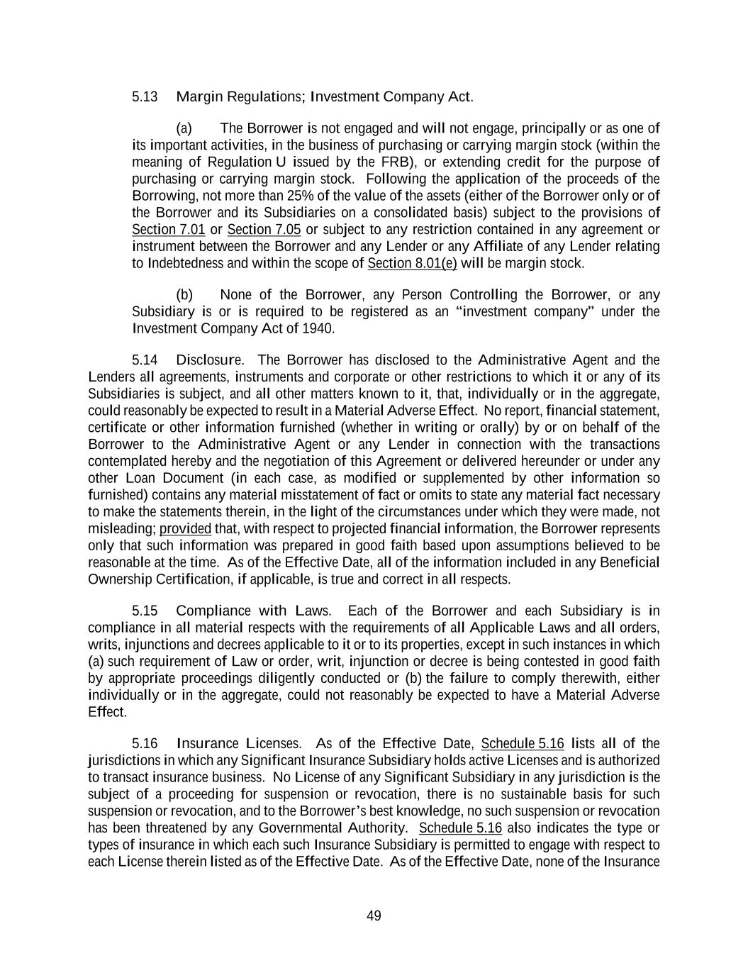 49 5.13 Margin Regulations; Investment Company Act. (a) The Borrower is not engaged and will not engage, principally or as one of its important activities, in the business of purchasing or carrying margin stock (within the meaning of Regulation U issued by the FRB), or extending credit for the purpose of purchasing or carrying margin stock. Following the application of the proceeds of the Borrowing, not more than 25% of the value of the assets (either of the Borrower only or of the Borrower and its Subsidiaries on a consolidated basis) subject to the provisions of Section 7.01 or Section 7.05 or subject to any restriction contained in any agreement or instrument between the Borrower and any Lender or any Affiliate of any Lender relating to Indebtedness and within the scope of Section 8.01(e) will be margin stock. (b) None of the Borrower, any Person Controlling the Borrower, or any Subsidiary is or is required to be registered as an “investment company” under the Investment Company Act of 1940. 5.14 Disclosure. The Borrower has disclosed to the Administrative Agent and the Lenders all agreements, instruments and corporate or other restrictions to which it or any of its Subsidiaries is subject, and all other matters known to it, that, individually or in the aggregate, could reasonably be expected to result in a Material Adverse Effect. No report, financial statement, certificate or other information furnished (whether in writing or orally) by or on behalf of the Borrower to the Administrative Agent or any Lender in connection with the transactions contemplated hereby and the negotiation of this Agreement or delivered hereunder or under any other Loan Document (in each case, as modified or supplemented by other information so furnished) contains any material misstatement of fact or omits to state any material fact necessary to make the statements therein, in the light of the circumstances under which they were made, not misleading; provided that, with respect to projected financial information, the Borrower represents only that such information was prepared in good faith based upon assumptions believed to be reasonable at the time. As of the Effective Date, all of the information included in any Beneficial Ownership Certification, if applicable, is true and correct in all respects. 5.15 Compliance with Laws. Each of the Borrower and each Subsidiary is in compliance in all material respects with the requirements of all Applicable Laws and all orders, writs, injunctions and decrees applicable to it or to its properties, except in such instances in which (a) such requirement of Law or order, writ, injunction or decree is being contested in good faith by appropriate proceedings diligently conducted or (b) the failure to comply therewith, either individually or in the aggregate, could not reasonably be expected to have a Material Adverse Effect. 5.16 Insurance Licenses. As of the Effective Date, Schedule 5.16 lists all of the jurisdictions in which any Significant Insurance Subsidiary holds active Licenses and is authorized to transact insurance business. No License of any Significant Subsidiary in any jurisdiction is the subject of a proceeding for suspension or revocation, there is no sustainable basis for such suspension or revocation, and to the Borrower’s best knowledge, no such suspension or revocation has been threatened by any Governmental Authority. Schedule 5.16 also indicates the type or types of insurance in which each such Insurance Subsidiary is permitted to engage with respect to each License therein listed as of the Effective Date. As of the Effective Date, none of the Insurance