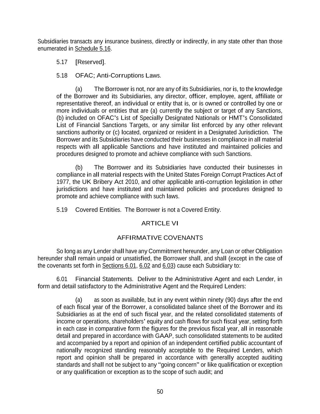 50 Subsidiaries transacts any insurance business, directly or indirectly, in any state other than those enumerated in Schedule 5.16. 5.17 [Reserved]. 5.18 OFAC; Anti-Corruptions Laws. (a) The Borrower is not, nor are any of its Subsidiaries, nor is, to the knowledge of the Borrower and its Subsidiaries, any director, officer, employee, agent, affiliate or representative thereof, an individual or entity that is, or is owned or controlled by one or more individuals or entities that are (a) currently the subject or target of any Sanctions, (b) included on OFAC’s List of Specially Designated Nationals or HMT’s Consolidated List of Financial Sanctions Targets, or any similar list enforced by any other relevant sanctions authority or (c) located, organized or resident in a Designated Jurisdiction. The Borrower and its Subsidiaries have conducted their businesses in compliance in all material respects with all applicable Sanctions and have instituted and maintained policies and procedures designed to promote and achieve compliance with such Sanctions. (b) The Borrower and its Subsidiaries have conducted their businesses in compliance in all material respects with the United States Foreign Corrupt Practices Act of 1977, the UK Bribery Act 2010, and other applicable anti-corruption legislation in other jurisdictions and have instituted and maintained policies and procedures designed to promote and achieve compliance with such laws. 5.19 Covered Entities. The Borrower is not a Covered Entity. ARTICLE VI AFFIRMATIVE COVENANTS So long as any Lender shall have any Commitment hereunder, any Loan or other Obligation hereunder shall remain unpaid or unsatisfied, the Borrower shall, and shall (except in the case of the covenants set forth in Sections 6.01, 6.02 and 6.03) cause each Subsidiary to: 6.01 Financial Statements. Deliver to the Administrative Agent and each Lender, in form and detail satisfactory to the Administrative Agent and the Required Lenders: (a) as soon as available, but in any event within ninety (90) days after the end of each fiscal year of the Borrower, a consolidated balance sheet of the Borrower and its Subsidiaries as at the end of such fiscal year, and the related consolidated statements of income or operations, shareholders’ equity and cash flows for such fiscal year, setting forth in each case in comparative form the figures for the previous fiscal year, all in reasonable detail and prepared in accordance with GAAP, such consolidated statements to be audited and accompanied by a report and opinion of an independent certified public accountant of nationally recognized standing reasonably acceptable to the Required Lenders, which report and opinion shall be prepared in accordance with generally accepted auditing standards and shall not be subject to any “going concern” or like qualification or exception or any qualification or exception as to the scope of such audit; and