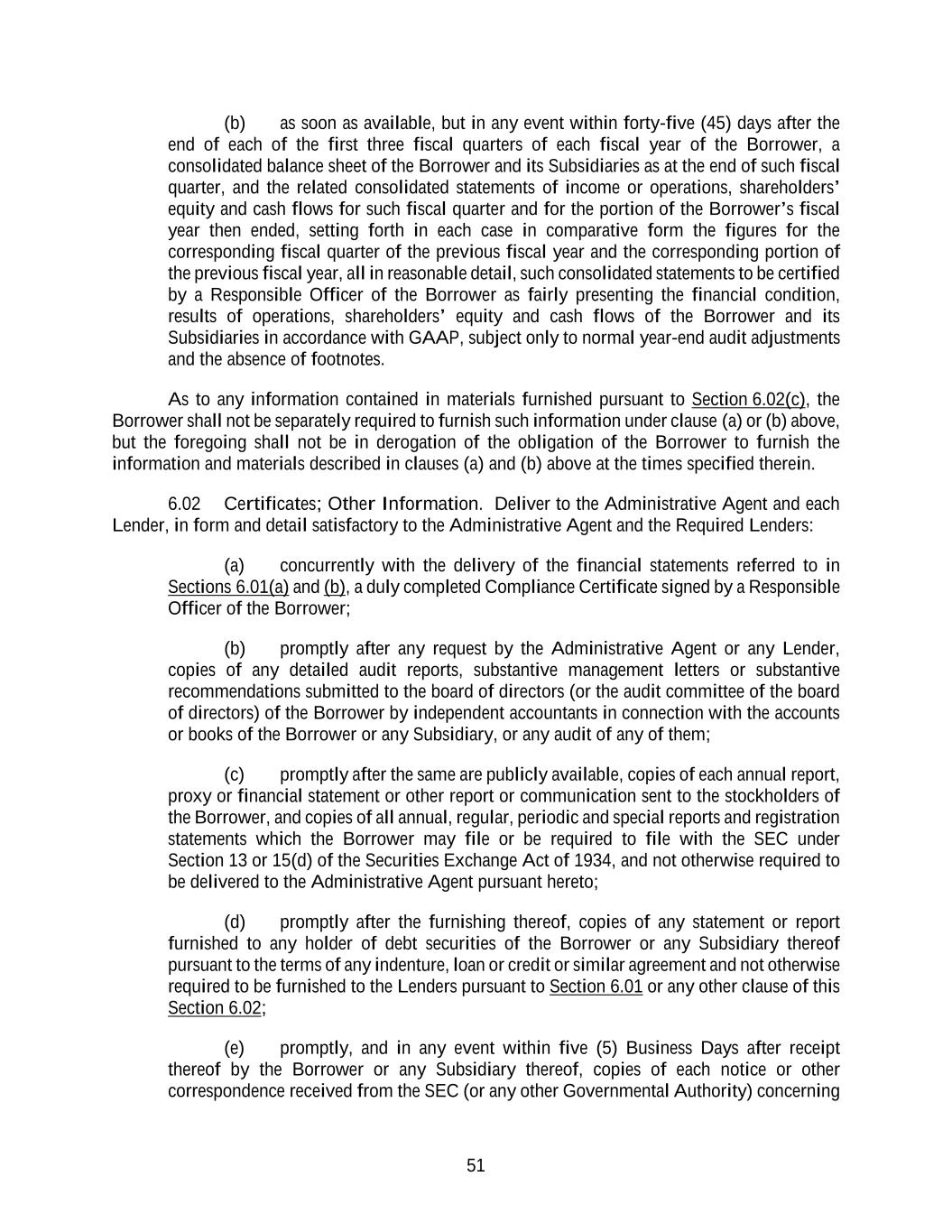 51 (b) as soon as available, but in any event within forty-five (45) days after the end of each of the first three fiscal quarters of each fiscal year of the Borrower, a consolidated balance sheet of the Borrower and its Subsidiaries as at the end of such fiscal quarter, and the related consolidated statements of income or operations, shareholders’ equity and cash flows for such fiscal quarter and for the portion of the Borrower’s fiscal year then ended, setting forth in each case in comparative form the figures for the corresponding fiscal quarter of the previous fiscal year and the corresponding portion of the previous fiscal year, all in reasonable detail, such consolidated statements to be certified by a Responsible Officer of the Borrower as fairly presenting the financial condition, results of operations, shareholders’ equity and cash flows of the Borrower and its Subsidiaries in accordance with GAAP, subject only to normal year-end audit adjustments and the absence of footnotes. As to any information contained in materials furnished pursuant to Section 6.02(c), the Borrower shall not be separately required to furnish such information under clause (a) or (b) above, but the foregoing shall not be in derogation of the obligation of the Borrower to furnish the information and materials described in clauses (a) and (b) above at the times specified therein. 6.02 Certificates; Other Information. Deliver to the Administrative Agent and each Lender, in form and detail satisfactory to the Administrative Agent and the Required Lenders: (a) concurrently with the delivery of the financial statements referred to in Sections 6.01(a) and (b), a duly completed Compliance Certificate signed by a Responsible Officer of the Borrower; (b) promptly after any request by the Administrative Agent or any Lender, copies of any detailed audit reports, substantive management letters or substantive recommendations submitted to the board of directors (or the audit committee of the board of directors) of the Borrower by independent accountants in connection with the accounts or books of the Borrower or any Subsidiary, or any audit of any of them; (c) promptly after the same are publicly available, copies of each annual report, proxy or financial statement or other report or communication sent to the stockholders of the Borrower, and copies of all annual, regular, periodic and special reports and registration statements which the Borrower may file or be required to file with the SEC under Section 13 or 15(d) of the Securities Exchange Act of 1934, and not otherwise required to be delivered to the Administrative Agent pursuant hereto; (d) promptly after the furnishing thereof, copies of any statement or report furnished to any holder of debt securities of the Borrower or any Subsidiary thereof pursuant to the terms of any indenture, loan or credit or similar agreement and not otherwise required to be furnished to the Lenders pursuant to Section 6.01 or any other clause of this Section 6.02; (e) promptly, and in any event within five (5) Business Days after receipt thereof by the Borrower or any Subsidiary thereof, copies of each notice or other correspondence received from the SEC (or any other Governmental Authority) concerning