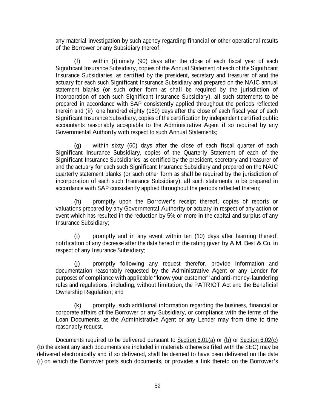 52 any material investigation by such agency regarding financial or other operational results of the Borrower or any Subsidiary thereof; (f) within (i) ninety (90) days after the close of each fiscal year of each Significant Insurance Subsidiary, copies of the Annual Statement of each of the Significant Insurance Subsidiaries, as certified by the president, secretary and treasurer of and the actuary for each such Significant Insurance Subsidiary and prepared on the NAIC annual statement blanks (or such other form as shall be required by the jurisdiction of incorporation of each such Significant Insurance Subsidiary), all such statements to be prepared in accordance with SAP consistently applied throughout the periods reflected therein and (ii) one hundred eighty (180) days after the close of each fiscal year of each Significant Insurance Subsidiary, copies of the certification by independent certified public accountants reasonably acceptable to the Administrative Agent if so required by any Governmental Authority with respect to such Annual Statements; (g) within sixty (60) days after the close of each fiscal quarter of each Significant Insurance Subsidiary, copies of the Quarterly Statement of each of the Significant Insurance Subsidiaries, as certified by the president, secretary and treasurer of and the actuary for each such Significant Insurance Subsidiary and prepared on the NAIC quarterly statement blanks (or such other form as shall be required by the jurisdiction of incorporation of each such Insurance Subsidiary), all such statements to be prepared in accordance with SAP consistently applied throughout the periods reflected therein; (h) promptly upon the Borrower’s receipt thereof, copies of reports or valuations prepared by any Governmental Authority or actuary in respect of any action or event which has resulted in the reduction by 5% or more in the capital and surplus of any Insurance Subsidiary; (i) promptly and in any event within ten (10) days after learning thereof, notification of any decrease after the date hereof in the rating given by A.M. Best & Co. in respect of any Insurance Subsidiary; (j) promptly following any request therefor, provide information and documentation reasonably requested by the Administrative Agent or any Lender for purposes of compliance with applicable “know your customer” and anti-money-laundering rules and regulations, including, without limitation, the PATRIOT Act and the Beneficial Ownership Regulation; and (k) promptly, such additional information regarding the business, financial or corporate affairs of the Borrower or any Subsidiary, or compliance with the terms of the Loan Documents, as the Administrative Agent or any Lender may from time to time reasonably request. Documents required to be delivered pursuant to Section 6.01(a) or (b) or Section 6.02(c) (to the extent any such documents are included in materials otherwise filed with the SEC) may be delivered electronically and if so delivered, shall be deemed to have been delivered on the date (i) on which the Borrower posts such documents, or provides a link thereto on the Borrower’s