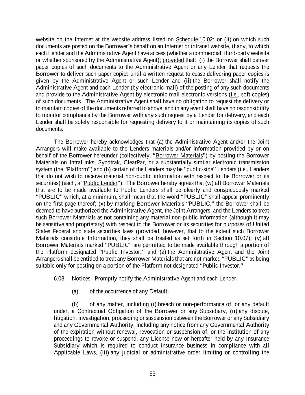 53 website on the Internet at the website address listed on Schedule 10.02; or (ii) on which such documents are posted on the Borrower’s behalf on an Internet or intranet website, if any, to which each Lender and the Administrative Agent have access (whether a commercial, third-party website or whether sponsored by the Administrative Agent); provided that: (i) the Borrower shall deliver paper copies of such documents to the Administrative Agent or any Lender that requests the Borrower to deliver such paper copies until a written request to cease delivering paper copies is given by the Administrative Agent or such Lender and (ii) the Borrower shall notify the Administrative Agent and each Lender (by electronic mail) of the posting of any such documents and provide to the Administrative Agent by electronic mail electronic versions (i.e., soft copies) of such documents. The Administrative Agent shall have no obligation to request the delivery or to maintain copies of the documents referred to above, and in any event shall have no responsibility to monitor compliance by the Borrower with any such request by a Lender for delivery, and each Lender shall be solely responsible for requesting delivery to it or maintaining its copies of such documents. The Borrower hereby acknowledges that (a) the Administrative Agent and/or the Joint Arrangers will make available to the Lenders materials and/or information provided by or on behalf of the Borrower hereunder (collectively, “Borrower Materials”) by posting the Borrower Materials on IntraLinks, Syndtrak, ClearPar, or a substantially similar electronic transmission system (the “Platform”) and (b) certain of the Lenders may be “public-side” Lenders (i.e., Lenders that do not wish to receive material non-public information with respect to the Borrower or its securities) (each, a “Public Lender”). The Borrower hereby agrees that (w) all Borrower Materials that are to be made available to Public Lenders shall be clearly and conspicuously marked “PUBLIC” which, at a minimum, shall mean that the word “PUBLIC” shall appear prominently on the first page thereof; (x) by marking Borrower Materials “PUBLIC,” the Borrower shall be deemed to have authorized the Administrative Agent, the Joint Arrangers, and the Lenders to treat such Borrower Materials as not containing any material non-public information (although it may be sensitive and proprietary) with respect to the Borrower or its securities for purposes of United States Federal and state securities laws (provided, however, that to the extent such Borrower Materials constitute Information, they shall be treated as set forth in Section 10.07); (y) all Borrower Materials marked “PUBLIC” are permitted to be made available through a portion of the Platform designated “Public Investor;” and (z) the Administrative Agent and the Joint Arrangers shall be entitled to treat any Borrower Materials that are not marked “PUBLIC” as being suitable only for posting on a portion of the Platform not designated “Public Investor.” 6.03 Notices. Promptly notify the Administrative Agent and each Lender: (a) of the occurrence of any Default; (b) of any matter, including (i) breach or non-performance of, or any default under, a Contractual Obligation of the Borrower or any Subsidiary, (ii) any dispute, litigation, investigation, proceeding or suspension between the Borrower or any Subsidiary and any Governmental Authority, including any notice from any Governmental Authority of the expiration without renewal, revocation or suspension of, or the institution of any proceedings to revoke or suspend, any License now or hereafter held by any Insurance Subsidiary which is required to conduct insurance business in compliance with all Applicable Laws, (iii) any judicial or administrative order limiting or controlling the