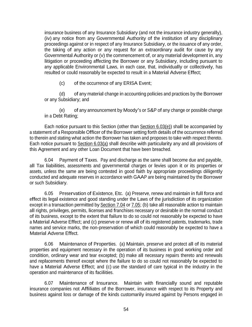54 insurance business of any Insurance Subsidiary (and not the insurance industry generally), (iv) any notice from any Governmental Authority of the institution of any disciplinary proceedings against or in respect of any Insurance Subsidiary, or the issuance of any order, the taking of any action or any request for an extraordinary audit for cause by any Governmental Authority or (v) the commencement of, or any material development in, any litigation or proceeding affecting the Borrower or any Subsidiary, including pursuant to any applicable Environmental Laws, in each case, that, individually or collectively, has resulted or could reasonably be expected to result in a Material Adverse Effect; (c) of the occurrence of any ERISA Event; (d) of any material change in accounting policies and practices by the Borrower or any Subsidiary; and (e) of any announcement by Moody’s or S&P of any change or possible change in a Debt Rating; Each notice pursuant to this Section (other than Section 6.03(e)) shall be accompanied by a statement of a Responsible Officer of the Borrower setting forth details of the occurrence referred to therein and stating what action the Borrower has taken and proposes to take with respect thereto. Each notice pursuant to Section 6.03(a) shall describe with particularity any and all provisions of this Agreement and any other Loan Document that have been breached. 6.04 Payment of Taxes. Pay and discharge as the same shall become due and payable, all Tax liabilities, assessments and governmental charges or levies upon it or its properties or assets, unless the same are being contested in good faith by appropriate proceedings diligently conducted and adequate reserves in accordance with GAAP are being maintained by the Borrower or such Subsidiary. 6.05 Preservation of Existence, Etc. (a) Preserve, renew and maintain in full force and effect its legal existence and good standing under the Laws of the jurisdiction of its organization except in a transaction permitted by Section 7.04 or 7.05; (b) take all reasonable action to maintain all rights, privileges, permits, licenses and franchises necessary or desirable in the normal conduct of its business, except to the extent that failure to do so could not reasonably be expected to have a Material Adverse Effect; and (c) preserve or renew all of its registered patents, trademarks, trade names and service marks, the non-preservation of which could reasonably be expected to have a Material Adverse Effect. 6.06 Maintenance of Properties. (a) Maintain, preserve and protect all of its material properties and equipment necessary in the operation of its business in good working order and condition, ordinary wear and tear excepted; (b) make all necessary repairs thereto and renewals and replacements thereof except where the failure to do so could not reasonably be expected to have a Material Adverse Effect; and (c) use the standard of care typical in the industry in the operation and maintenance of its facilities. 6.07 Maintenance of Insurance. Maintain with financially sound and reputable insurance companies not Affiliates of the Borrower, insurance with respect to its Property and business against loss or damage of the kinds customarily insured against by Persons engaged in