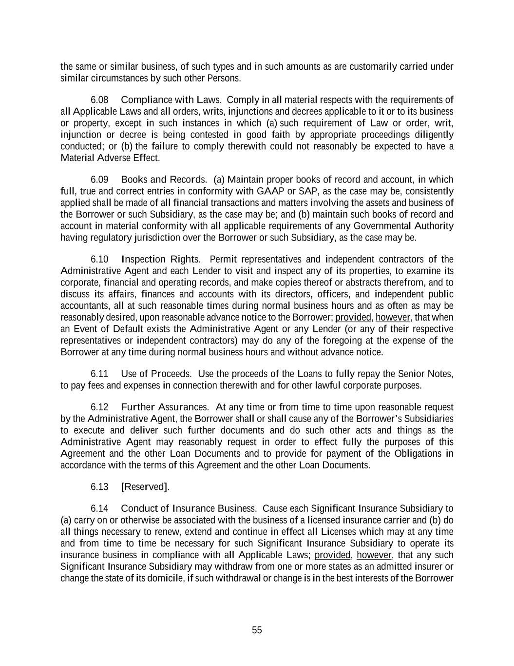 55 the same or similar business, of such types and in such amounts as are customarily carried under similar circumstances by such other Persons. 6.08 Compliance with Laws. Comply in all material respects with the requirements of all Applicable Laws and all orders, writs, injunctions and decrees applicable to it or to its business or property, except in such instances in which (a) such requirement of Law or order, writ, injunction or decree is being contested in good faith by appropriate proceedings diligently conducted; or (b) the failure to comply therewith could not reasonably be expected to have a Material Adverse Effect. 6.09 Books and Records. (a) Maintain proper books of record and account, in which full, true and correct entries in conformity with GAAP or SAP, as the case may be, consistently applied shall be made of all financial transactions and matters involving the assets and business of the Borrower or such Subsidiary, as the case may be; and (b) maintain such books of record and account in material conformity with all applicable requirements of any Governmental Authority having regulatory jurisdiction over the Borrower or such Subsidiary, as the case may be. 6.10 Inspection Rights. Permit representatives and independent contractors of the Administrative Agent and each Lender to visit and inspect any of its properties, to examine its corporate, financial and operating records, and make copies thereof or abstracts therefrom, and to discuss its affairs, finances and accounts with its directors, officers, and independent public accountants, all at such reasonable times during normal business hours and as often as may be reasonably desired, upon reasonable advance notice to the Borrower; provided, however, that when an Event of Default exists the Administrative Agent or any Lender (or any of their respective representatives or independent contractors) may do any of the foregoing at the expense of the Borrower at any time during normal business hours and without advance notice. 6.11 Use of Proceeds. Use the proceeds of the Loans to fully repay the Senior Notes, to pay fees and expenses in connection therewith and for other lawful corporate purposes. 6.12 Further Assurances. At any time or from time to time upon reasonable request by the Administrative Agent, the Borrower shall or shall cause any of the Borrower’s Subsidiaries to execute and deliver such further documents and do such other acts and things as the Administrative Agent may reasonably request in order to effect fully the purposes of this Agreement and the other Loan Documents and to provide for payment of the Obligations in accordance with the terms of this Agreement and the other Loan Documents. 6.13 [Reserved]. 6.14 Conduct of Insurance Business. Cause each Significant Insurance Subsidiary to (a) carry on or otherwise be associated with the business of a licensed insurance carrier and (b) do all things necessary to renew, extend and continue in effect all Licenses which may at any time and from time to time be necessary for such Significant Insurance Subsidiary to operate its insurance business in compliance with all Applicable Laws; provided, however, that any such Significant Insurance Subsidiary may withdraw from one or more states as an admitted insurer or change the state of its domicile, if such withdrawal or change is in the best interests of the Borrower