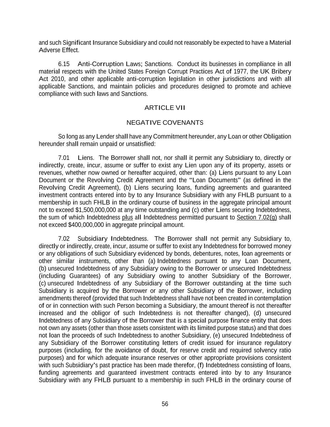 56 and such Significant Insurance Subsidiary and could not reasonably be expected to have a Material Adverse Effect. 6.15 Anti-Corruption Laws; Sanctions. Conduct its businesses in compliance in all material respects with the United States Foreign Corrupt Practices Act of 1977, the UK Bribery Act 2010, and other applicable anti-corruption legislation in other jurisdictions and with all applicable Sanctions, and maintain policies and procedures designed to promote and achieve compliance with such laws and Sanctions. ARTICLE VII NEGATIVE COVENANTS So long as any Lender shall have any Commitment hereunder, any Loan or other Obligation hereunder shall remain unpaid or unsatisfied: 7.01 Liens. The Borrower shall not, nor shall it permit any Subsidiary to, directly or indirectly, create, incur, assume or suffer to exist any Lien upon any of its property, assets or revenues, whether now owned or hereafter acquired, other than: (a) Liens pursuant to any Loan Document or the Revolving Credit Agreement and the “Loan Documents” (as defined in the Revolving Credit Agreement), (b) Liens securing loans, funding agreements and guaranteed investment contracts entered into by to any Insurance Subsidiary with any FHLB pursuant to a membership in such FHLB in the ordinary course of business in the aggregate principal amount not to exceed $1,500,000,000 at any time outstanding and (c) other Liens securing Indebtedness, the sum of which Indebtedness plus all Indebtedness permitted pursuant to Section 7.02(g) shall not exceed $400,000,000 in aggregate principal amount. 7.02 Subsidiary Indebtedness. The Borrower shall not permit any Subsidiary to, directly or indirectly, create, incur, assume or suffer to exist any Indebtedness for borrowed money or any obligations of such Subsidiary evidenced by bonds, debentures, notes, loan agreements or other similar instruments, other than (a) Indebtedness pursuant to any Loan Document, (b) unsecured Indebtedness of any Subsidiary owing to the Borrower or unsecured Indebtedness (including Guarantees) of any Subsidiary owing to another Subsidiary of the Borrower, (c) unsecured Indebtedness of any Subsidiary of the Borrower outstanding at the time such Subsidiary is acquired by the Borrower or any other Subsidiary of the Borrower, including amendments thereof (provided that such Indebtedness shall have not been created in contemplation of or in connection with such Person becoming a Subsidiary, the amount thereof is not thereafter increased and the obligor of such Indebtedness is not thereafter changed), (d) unsecured Indebtedness of any Subsidiary of the Borrower that is a special purpose finance entity that does not own any assets (other than those assets consistent with its limited purpose status) and that does not loan the proceeds of such Indebtedness to another Subsidiary, (e) unsecured Indebtedness of any Subsidiary of the Borrower constituting letters of credit issued for insurance regulatory purposes (including, for the avoidance of doubt, for reserve credit and required solvency ratio purposes) and for which adequate insurance reserves or other appropriate provisions consistent with such Subsidiary’s past practice has been made therefor, (f) Indebtedness consisting of loans, funding agreements and guaranteed investment contracts entered into by to any Insurance Subsidiary with any FHLB pursuant to a membership in such FHLB in the ordinary course of