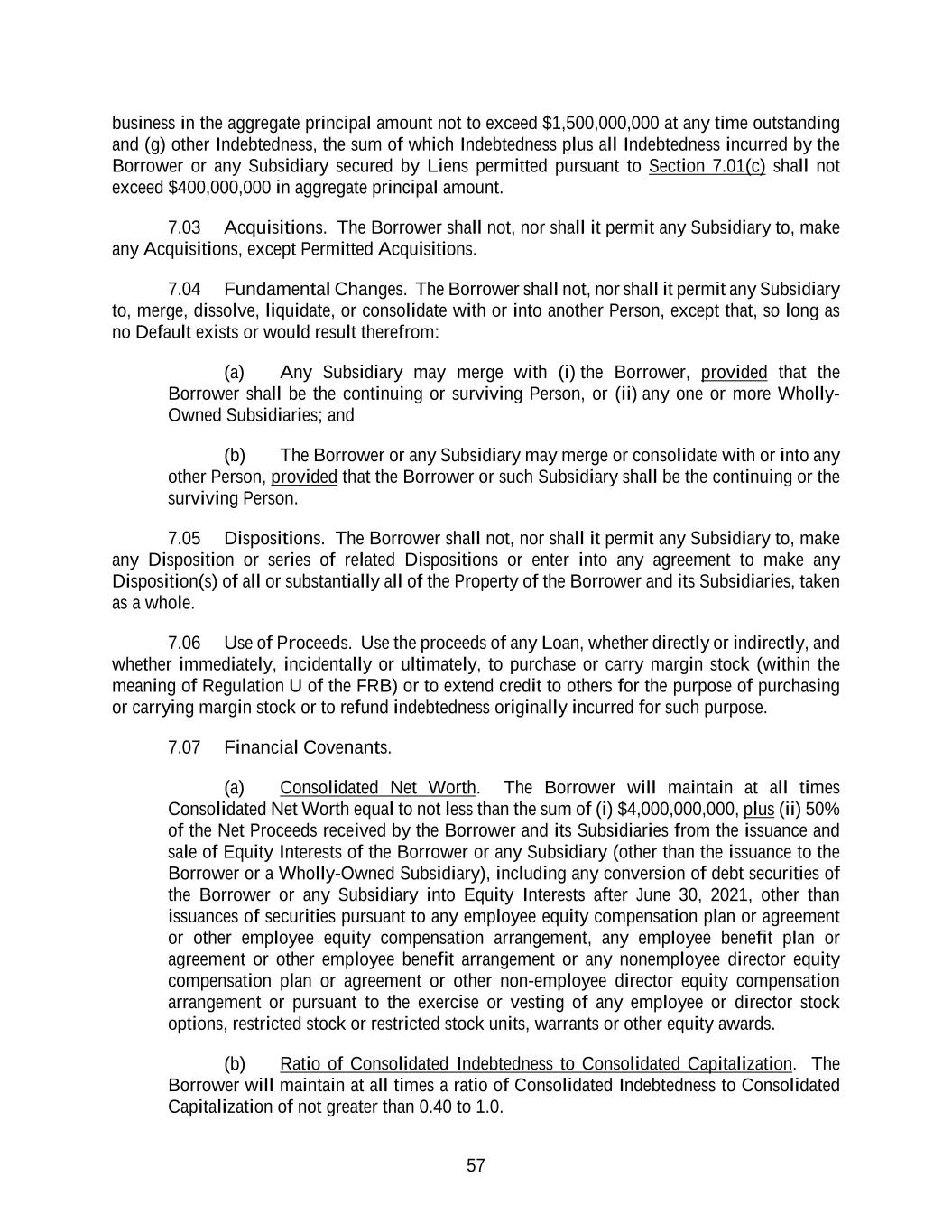 57 business in the aggregate principal amount not to exceed $1,500,000,000 at any time outstanding and (g) other Indebtedness, the sum of which Indebtedness plus all Indebtedness incurred by the Borrower or any Subsidiary secured by Liens permitted pursuant to Section 7.01(c) shall not exceed $400,000,000 in aggregate principal amount. 7.03 Acquisitions. The Borrower shall not, nor shall it permit any Subsidiary to, make any Acquisitions, except Permitted Acquisitions. 7.04 Fundamental Changes. The Borrower shall not, nor shall it permit any Subsidiary to, merge, dissolve, liquidate, or consolidate with or into another Person, except that, so long as no Default exists or would result therefrom: (a) Any Subsidiary may merge with (i) the Borrower, provided that the Borrower shall be the continuing or surviving Person, or (ii) any one or more Wholly- Owned Subsidiaries; and (b) The Borrower or any Subsidiary may merge or consolidate with or into any other Person, provided that the Borrower or such Subsidiary shall be the continuing or the surviving Person. 7.05 Dispositions. The Borrower shall not, nor shall it permit any Subsidiary to, make any Disposition or series of related Dispositions or enter into any agreement to make any Disposition(s) of all or substantially all of the Property of the Borrower and its Subsidiaries, taken as a whole. 7.06 Use of Proceeds. Use the proceeds of any Loan, whether directly or indirectly, and whether immediately, incidentally or ultimately, to purchase or carry margin stock (within the meaning of Regulation U of the FRB) or to extend credit to others for the purpose of purchasing or carrying margin stock or to refund indebtedness originally incurred for such purpose. 7.07 Financial Covenants. (a) Consolidated Net Worth. The Borrower will maintain at all times Consolidated Net Worth equal to not less than the sum of (i) $4,000,000,000, plus (ii) 50% of the Net Proceeds received by the Borrower and its Subsidiaries from the issuance and sale of Equity Interests of the Borrower or any Subsidiary (other than the issuance to the Borrower or a Wholly-Owned Subsidiary), including any conversion of debt securities of the Borrower or any Subsidiary into Equity Interests after June 30, 2021, other than issuances of securities pursuant to any employee equity compensation plan or agreement or other employee equity compensation arrangement, any employee benefit plan or agreement or other employee benefit arrangement or any nonemployee director equity compensation plan or agreement or other non-employee director equity compensation arrangement or pursuant to the exercise or vesting of any employee or director stock options, restricted stock or restricted stock units, warrants or other equity awards. (b) Ratio of Consolidated Indebtedness to Consolidated Capitalization. The Borrower will maintain at all times a ratio of Consolidated Indebtedness to Consolidated Capitalization of not greater than 0.40 to 1.0.