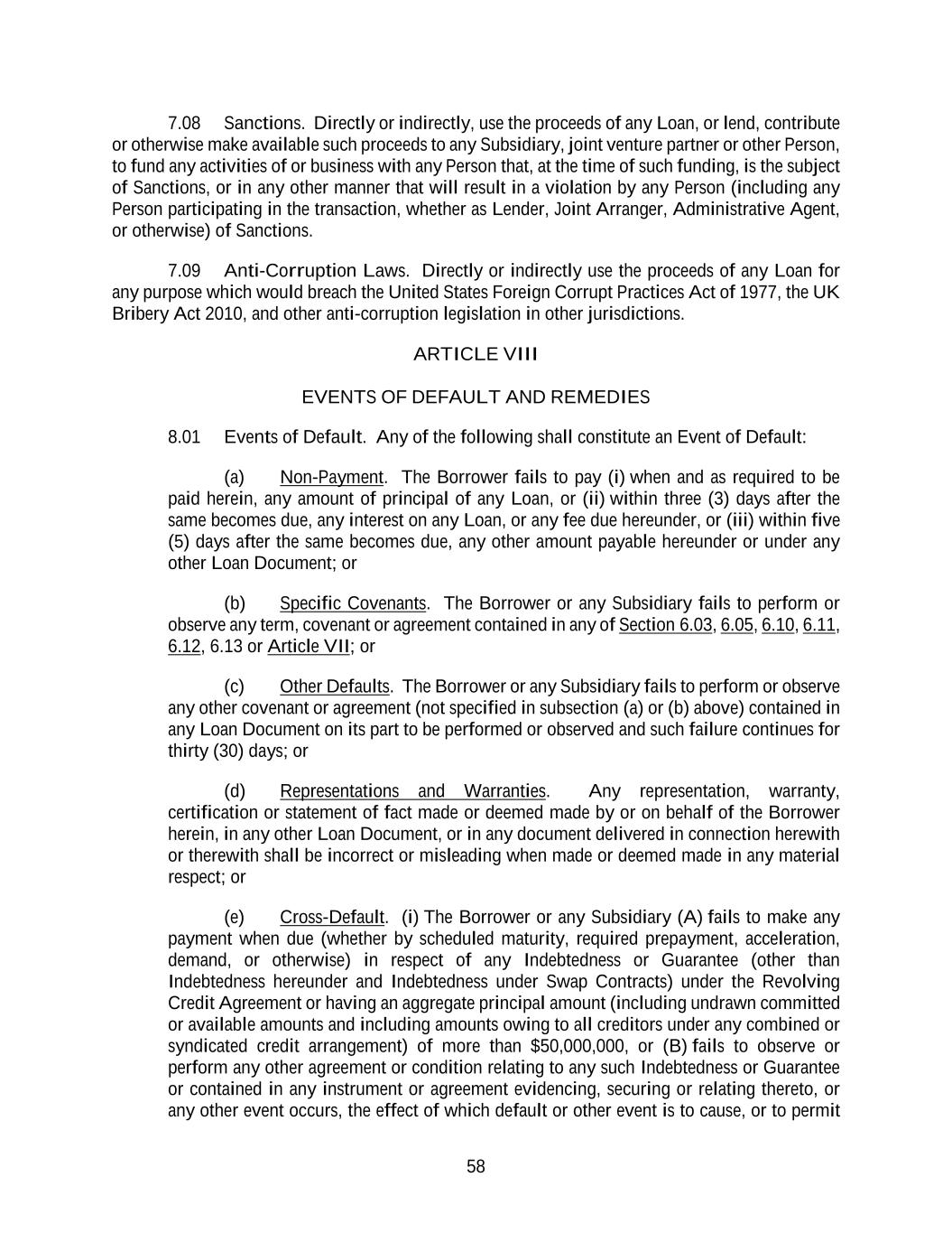 58 7.08 Sanctions. Directly or indirectly, use the proceeds of any Loan, or lend, contribute or otherwise make available such proceeds to any Subsidiary, joint venture partner or other Person, to fund any activities of or business with any Person that, at the time of such funding, is the subject of Sanctions, or in any other manner that will result in a violation by any Person (including any Person participating in the transaction, whether as Lender, Joint Arranger, Administrative Agent, or otherwise) of Sanctions. 7.09 Anti-Corruption Laws. Directly or indirectly use the proceeds of any Loan for any purpose which would breach the United States Foreign Corrupt Practices Act of 1977, the UK Bribery Act 2010, and other anti-corruption legislation in other jurisdictions. ARTICLE VIII EVENTS OF DEFAULT AND REMEDIES 8.01 Events of Default. Any of the following shall constitute an Event of Default: (a) Non-Payment. The Borrower fails to pay (i) when and as required to be paid herein, any amount of principal of any Loan, or (ii) within three (3) days after the same becomes due, any interest on any Loan, or any fee due hereunder, or (iii) within five (5) days after the same becomes due, any other amount payable hereunder or under any other Loan Document; or (b) Specific Covenants. The Borrower or any Subsidiary fails to perform or observe any term, covenant or agreement contained in any of Section 6.03, 6.05, 6.10, 6.11, 6.12, 6.13 or Article VII; or (c) Other Defaults. The Borrower or any Subsidiary fails to perform or observe any other covenant or agreement (not specified in subsection (a) or (b) above) contained in any Loan Document on its part to be performed or observed and such failure continues for thirty (30) days; or (d) Representations and Warranties. Any representation, warranty, certification or statement of fact made or deemed made by or on behalf of the Borrower herein, in any other Loan Document, or in any document delivered in connection herewith or therewith shall be incorrect or misleading when made or deemed made in any material respect; or (e) Cross-Default. (i) The Borrower or any Subsidiary (A) fails to make any payment when due (whether by scheduled maturity, required prepayment, acceleration, demand, or otherwise) in respect of any Indebtedness or Guarantee (other than Indebtedness hereunder and Indebtedness under Swap Contracts) under the Revolving Credit Agreement or having an aggregate principal amount (including undrawn committed or available amounts and including amounts owing to all creditors under any combined or syndicated credit arrangement) of more than $50,000,000, or (B) fails to observe or perform any other agreement or condition relating to any such Indebtedness or Guarantee or contained in any instrument or agreement evidencing, securing or relating thereto, or any other event occurs, the effect of which default or other event is to cause, or to permit