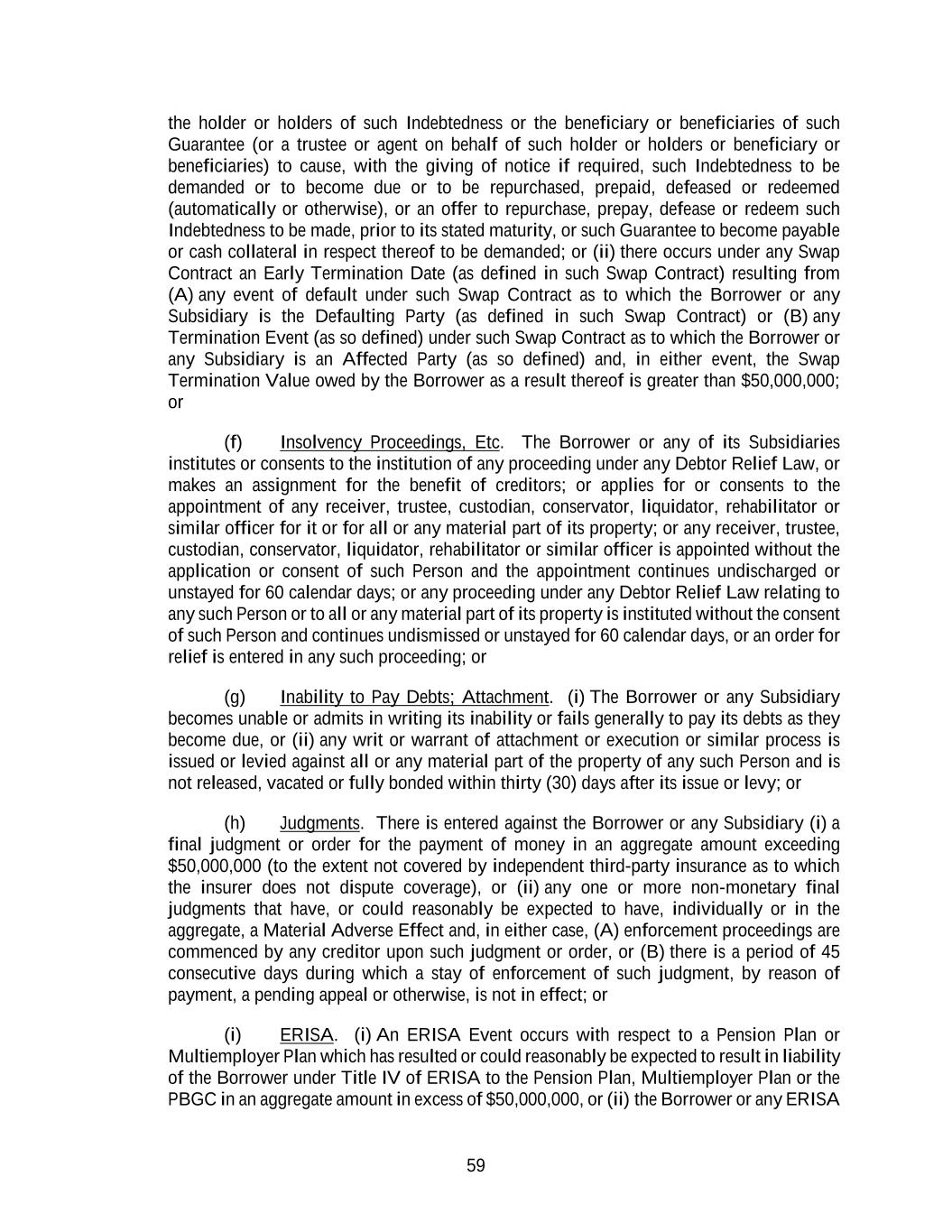 59 the holder or holders of such Indebtedness or the beneficiary or beneficiaries of such Guarantee (or a trustee or agent on behalf of such holder or holders or beneficiary or beneficiaries) to cause, with the giving of notice if required, such Indebtedness to be demanded or to become due or to be repurchased, prepaid, defeased or redeemed (automatically or otherwise), or an offer to repurchase, prepay, defease or redeem such Indebtedness to be made, prior to its stated maturity, or such Guarantee to become payable or cash collateral in respect thereof to be demanded; or (ii) there occurs under any Swap Contract an Early Termination Date (as defined in such Swap Contract) resulting from (A) any event of default under such Swap Contract as to which the Borrower or any Subsidiary is the Defaulting Party (as defined in such Swap Contract) or (B) any Termination Event (as so defined) under such Swap Contract as to which the Borrower or any Subsidiary is an Affected Party (as so defined) and, in either event, the Swap Termination Value owed by the Borrower as a result thereof is greater than $50,000,000; or (f) Insolvency Proceedings, Etc. The Borrower or any of its Subsidiaries institutes or consents to the institution of any proceeding under any Debtor Relief Law, or makes an assignment for the benefit of creditors; or applies for or consents to the appointment of any receiver, trustee, custodian, conservator, liquidator, rehabilitator or similar officer for it or for all or any material part of its property; or any receiver, trustee, custodian, conservator, liquidator, rehabilitator or similar officer is appointed without the application or consent of such Person and the appointment continues undischarged or unstayed for 60 calendar days; or any proceeding under any Debtor Relief Law relating to any such Person or to all or any material part of its property is instituted without the consent of such Person and continues undismissed or unstayed for 60 calendar days, or an order for relief is entered in any such proceeding; or (g) Inability to Pay Debts; Attachment. (i) The Borrower or any Subsidiary becomes unable or admits in writing its inability or fails generally to pay its debts as they become due, or (ii) any writ or warrant of attachment or execution or similar process is issued or levied against all or any material part of the property of any such Person and is not released, vacated or fully bonded within thirty (30) days after its issue or levy; or (h) Judgments. There is entered against the Borrower or any Subsidiary (i) a final judgment or order for the payment of money in an aggregate amount exceeding $50,000,000 (to the extent not covered by independent third-party insurance as to which the insurer does not dispute coverage), or (ii) any one or more non-monetary final judgments that have, or could reasonably be expected to have, individually or in the aggregate, a Material Adverse Effect and, in either case, (A) enforcement proceedings are commenced by any creditor upon such judgment or order, or (B) there is a period of 45 consecutive days during which a stay of enforcement of such judgment, by reason of payment, a pending appeal or otherwise, is not in effect; or (i) ERISA. (i) An ERISA Event occurs with respect to a Pension Plan or Multiemployer Plan which has resulted or could reasonably be expected to result in liability of the Borrower under Title IV of ERISA to the Pension Plan, Multiemployer Plan or the PBGC in an aggregate amount in excess of $50,000,000, or (ii) the Borrower or any ERISA
