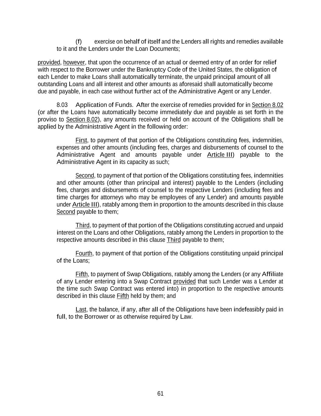 61 (f) exercise on behalf of itself and the Lenders all rights and remedies available to it and the Lenders under the Loan Documents; provided, however, that upon the occurrence of an actual or deemed entry of an order for relief with respect to the Borrower under the Bankruptcy Code of the United States, the obligation of each Lender to make Loans shall automatically terminate, the unpaid principal amount of all outstanding Loans and all interest and other amounts as aforesaid shall automatically become due and payable, in each case without further act of the Administrative Agent or any Lender. 8.03 Application of Funds. After the exercise of remedies provided for in Section 8.02 (or after the Loans have automatically become immediately due and payable as set forth in the proviso to Section 8.02), any amounts received or held on account of the Obligations shall be applied by the Administrative Agent in the following order: First, to payment of that portion of the Obligations constituting fees, indemnities, expenses and other amounts (including fees, charges and disbursements of counsel to the Administrative Agent and amounts payable under Article III) payable to the Administrative Agent in its capacity as such; Second, to payment of that portion of the Obligations constituting fees, indemnities and other amounts (other than principal and interest) payable to the Lenders (including fees, charges and disbursements of counsel to the respective Lenders (including fees and time charges for attorneys who may be employees of any Lender) and amounts payable under Article III), ratably among them in proportion to the amounts described in this clause Second payable to them; Third, to payment of that portion of the Obligations constituting accrued and unpaid interest on the Loans and other Obligations, ratably among the Lenders in proportion to the respective amounts described in this clause Third payable to them; Fourth, to payment of that portion of the Obligations constituting unpaid principal of the Loans; Fifth, to payment of Swap Obligations, ratably among the Lenders (or any Affiliate of any Lender entering into a Swap Contract provided that such Lender was a Lender at the time such Swap Contract was entered into) in proportion to the respective amounts described in this clause Fifth held by them; and Last, the balance, if any, after all of the Obligations have been indefeasibly paid in full, to the Borrower or as otherwise required by Law.