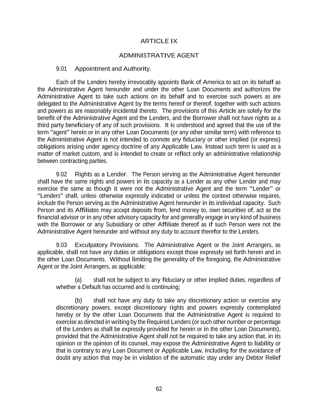 62 ARTICLE IX ADMINISTRATIVE AGENT 9.01 Appointment and Authority. Each of the Lenders hereby irrevocably appoints Bank of America to act on its behalf as the Administrative Agent hereunder and under the other Loan Documents and authorizes the Administrative Agent to take such actions on its behalf and to exercise such powers as are delegated to the Administrative Agent by the terms hereof or thereof, together with such actions and powers as are reasonably incidental thereto. The provisions of this Article are solely for the benefit of the Administrative Agent and the Lenders, and the Borrower shall not have rights as a third party beneficiary of any of such provisions. It is understood and agreed that the use of the term “agent” herein or in any other Loan Documents (or any other similar term) with reference to the Administrative Agent is not intended to connote any fiduciary or other implied (or express) obligations arising under agency doctrine of any Applicable Law. Instead such term is used as a matter of market custom, and is intended to create or reflect only an administrative relationship between contracting parties. 9.02 Rights as a Lender. The Person serving as the Administrative Agent hereunder shall have the same rights and powers in its capacity as a Lender as any other Lender and may exercise the same as though it were not the Administrative Agent and the term “Lender” or “Lenders” shall, unless otherwise expressly indicated or unless the context otherwise requires, include the Person serving as the Administrative Agent hereunder in its individual capacity. Such Person and its Affiliates may accept deposits from, lend money to, own securities of, act as the financial advisor or in any other advisory capacity for and generally engage in any kind of business with the Borrower or any Subsidiary or other Affiliate thereof as if such Person were not the Administrative Agent hereunder and without any duty to account therefor to the Lenders. 9.03 Exculpatory Provisions. The Administrative Agent or the Joint Arrangers, as applicable, shall not have any duties or obligations except those expressly set forth herein and in the other Loan Documents. Without limiting the generality of the foregoing, the Administrative Agent or the Joint Arrangers, as applicable: (a) shall not be subject to any fiduciary or other implied duties, regardless of whether a Default has occurred and is continuing; (b) shall not have any duty to take any discretionary action or exercise any discretionary powers, except discretionary rights and powers expressly contemplated hereby or by the other Loan Documents that the Administrative Agent is required to exercise as directed in writing by the Required Lenders (or such other number or percentage of the Lenders as shall be expressly provided for herein or in the other Loan Documents), provided that the Administrative Agent shall not be required to take any action that, in its opinion or the opinion of its counsel, may expose the Administrative Agent to liability or that is contrary to any Loan Document or Applicable Law, including for the avoidance of doubt any action that may be in violation of the automatic stay under any Debtor Relief