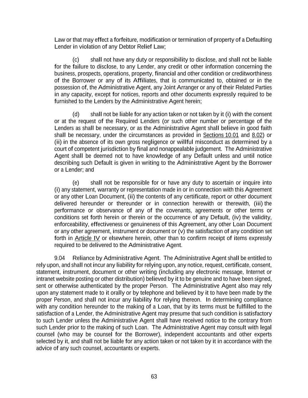 63 Law or that may effect a forfeiture, modification or termination of property of a Defaulting Lender in violation of any Debtor Relief Law; (c) shall not have any duty or responsibility to disclose, and shall not be liable for the failure to disclose, to any Lender, any credit or other information concerning the business, prospects, operations, property, financial and other condition or creditworthiness of the Borrower or any of its Affiliates, that is communicated to, obtained or in the possession of, the Administrative Agent, any Joint Arranger or any of their Related Parties in any capacity, except for notices, reports and other documents expressly required to be furnished to the Lenders by the Administrative Agent herein; (d) shall not be liable for any action taken or not taken by it (i) with the consent or at the request of the Required Lenders (or such other number or percentage of the Lenders as shall be necessary, or as the Administrative Agent shall believe in good faith shall be necessary, under the circumstances as provided in Sections 10.01 and 8.02) or (ii) in the absence of its own gross negligence or willful misconduct as determined by a court of competent jurisdiction by final and nonappealable judgement. The Administrative Agent shall be deemed not to have knowledge of any Default unless and until notice describing such Default is given in writing to the Administrative Agent by the Borrower or a Lender; and (e) shall not be responsible for or have any duty to ascertain or inquire into (i) any statement, warranty or representation made in or in connection with this Agreement or any other Loan Document, (ii) the contents of any certificate, report or other document delivered hereunder or thereunder or in connection herewith or therewith, (iii) the performance or observance of any of the covenants, agreements or other terms or conditions set forth herein or therein or the occurrence of any Default, (iv) the validity, enforceability, effectiveness or genuineness of this Agreement, any other Loan Document or any other agreement, instrument or document or (v) the satisfaction of any condition set forth in Article IV or elsewhere herein, other than to confirm receipt of items expressly required to be delivered to the Administrative Agent. 9.04 Reliance by Administrative Agent. The Administrative Agent shall be entitled to rely upon, and shall not incur any liability for relying upon, any notice, request, certificate, consent, statement, instrument, document or other writing (including any electronic message, Internet or intranet website posting or other distribution) believed by it to be genuine and to have been signed, sent or otherwise authenticated by the proper Person. The Administrative Agent also may rely upon any statement made to it orally or by telephone and believed by it to have been made by the proper Person, and shall not incur any liability for relying thereon. In determining compliance with any condition hereunder to the making of a Loan, that by its terms must be fulfilled to the satisfaction of a Lender, the Administrative Agent may presume that such condition is satisfactory to such Lender unless the Administrative Agent shall have received notice to the contrary from such Lender prior to the making of such Loan. The Administrative Agent may consult with legal counsel (who may be counsel for the Borrower), independent accountants and other experts selected by it, and shall not be liable for any action taken or not taken by it in accordance with the advice of any such counsel, accountants or experts.