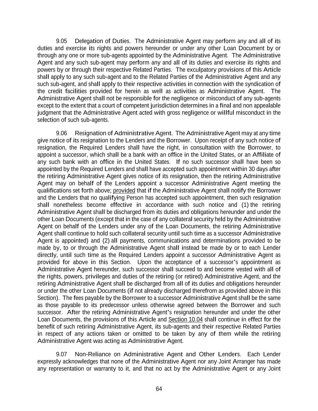 64 9.05 Delegation of Duties. The Administrative Agent may perform any and all of its duties and exercise its rights and powers hereunder or under any other Loan Document by or through any one or more sub-agents appointed by the Administrative Agent. The Administrative Agent and any such sub-agent may perform any and all of its duties and exercise its rights and powers by or through their respective Related Parties. The exculpatory provisions of this Article shall apply to any such sub-agent and to the Related Parties of the Administrative Agent and any such sub-agent, and shall apply to their respective activities in connection with the syndication of the credit facilities provided for herein as well as activities as Administrative Agent. The Administrative Agent shall not be responsible for the negligence or misconduct of any sub-agents except to the extent that a court of competent jurisdiction determines in a final and non appealable judgment that the Administrative Agent acted with gross negligence or willful misconduct in the selection of such sub-agents. 9.06 Resignation of Administrative Agent. The Administrative Agent may at any time give notice of its resignation to the Lenders and the Borrower. Upon receipt of any such notice of resignation, the Required Lenders shall have the right, in consultation with the Borrower, to appoint a successor, which shall be a bank with an office in the United States, or an Affiliate of any such bank with an office in the United States. If no such successor shall have been so appointed by the Required Lenders and shall have accepted such appointment within 30 days after the retiring Administrative Agent gives notice of its resignation, then the retiring Administrative Agent may on behalf of the Lenders appoint a successor Administrative Agent meeting the qualifications set forth above; provided that if the Administrative Agent shall notify the Borrower and the Lenders that no qualifying Person has accepted such appointment, then such resignation shall nonetheless become effective in accordance with such notice and (1) the retiring Administrative Agent shall be discharged from its duties and obligations hereunder and under the other Loan Documents (except that in the case of any collateral security held by the Administrative Agent on behalf of the Lenders under any of the Loan Documents, the retiring Administrative Agent shall continue to hold such collateral security until such time as a successor Administrative Agent is appointed) and (2) all payments, communications and determinations provided to be made by, to or through the Administrative Agent shall instead be made by or to each Lender directly, until such time as the Required Lenders appoint a successor Administrative Agent as provided for above in this Section. Upon the acceptance of a successor’s appointment as Administrative Agent hereunder, such successor shall succeed to and become vested with all of the rights, powers, privileges and duties of the retiring (or retired) Administrative Agent, and the retiring Administrative Agent shall be discharged from all of its duties and obligations hereunder or under the other Loan Documents (if not already discharged therefrom as provided above in this Section). The fees payable by the Borrower to a successor Administrative Agent shall be the same as those payable to its predecessor unless otherwise agreed between the Borrower and such successor. After the retiring Administrative Agent’s resignation hereunder and under the other Loan Documents, the provisions of this Article and Section 10.04 shall continue in effect for the benefit of such retiring Administrative Agent, its sub-agents and their respective Related Parties in respect of any actions taken or omitted to be taken by any of them while the retiring Administrative Agent was acting as Administrative Agent. 9.07 Non-Reliance on Administrative Agent and Other Lenders. Each Lender expressly acknowledges that none of the Administrative Agent nor any Joint Arranger has made any representation or warranty to it, and that no act by the Administrative Agent or any Joint