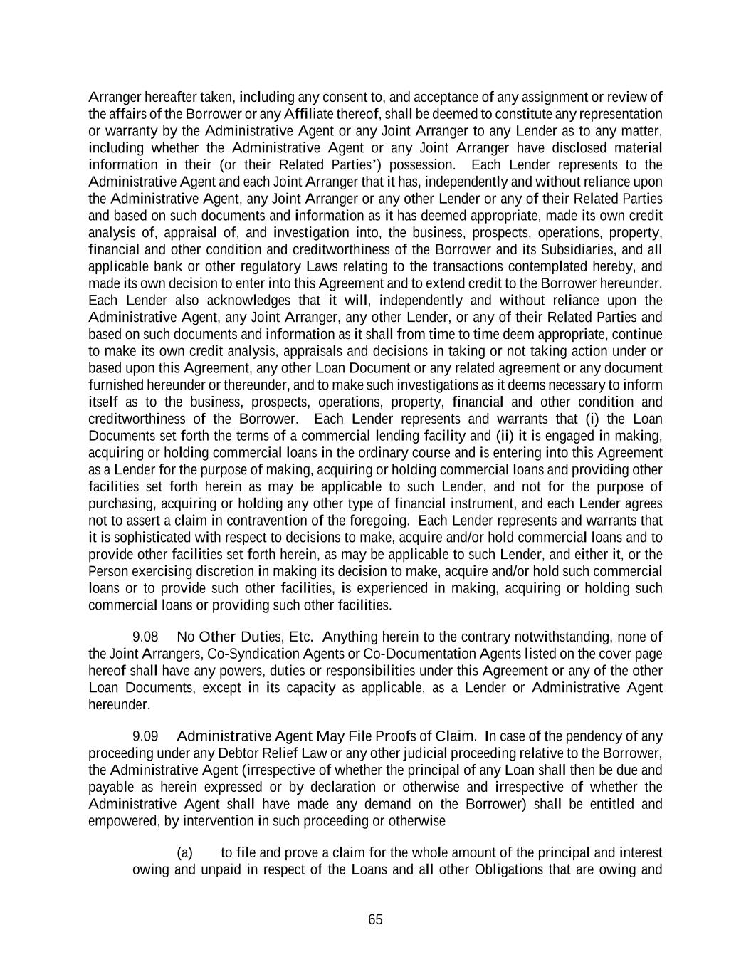 65 Arranger hereafter taken, including any consent to, and acceptance of any assignment or review of the affairs of the Borrower or any Affiliate thereof, shall be deemed to constitute any representation or warranty by the Administrative Agent or any Joint Arranger to any Lender as to any matter, including whether the Administrative Agent or any Joint Arranger have disclosed material information in their (or their Related Parties’) possession. Each Lender represents to the Administrative Agent and each Joint Arranger that it has, independently and without reliance upon the Administrative Agent, any Joint Arranger or any other Lender or any of their Related Parties and based on such documents and information as it has deemed appropriate, made its own credit analysis of, appraisal of, and investigation into, the business, prospects, operations, property, financial and other condition and creditworthiness of the Borrower and its Subsidiaries, and all applicable bank or other regulatory Laws relating to the transactions contemplated hereby, and made its own decision to enter into this Agreement and to extend credit to the Borrower hereunder. Each Lender also acknowledges that it will, independently and without reliance upon the Administrative Agent, any Joint Arranger, any other Lender, or any of their Related Parties and based on such documents and information as it shall from time to time deem appropriate, continue to make its own credit analysis, appraisals and decisions in taking or not taking action under or based upon this Agreement, any other Loan Document or any related agreement or any document furnished hereunder or thereunder, and to make such investigations as it deems necessary to inform itself as to the business, prospects, operations, property, financial and other condition and creditworthiness of the Borrower. Each Lender represents and warrants that (i) the Loan Documents set forth the terms of a commercial lending facility and (ii) it is engaged in making, acquiring or holding commercial loans in the ordinary course and is entering into this Agreement as a Lender for the purpose of making, acquiring or holding commercial loans and providing other facilities set forth herein as may be applicable to such Lender, and not for the purpose of purchasing, acquiring or holding any other type of financial instrument, and each Lender agrees not to assert a claim in contravention of the foregoing. Each Lender represents and warrants that it is sophisticated with respect to decisions to make, acquire and/or hold commercial loans and to provide other facilities set forth herein, as may be applicable to such Lender, and either it, or the Person exercising discretion in making its decision to make, acquire and/or hold such commercial loans or to provide such other facilities, is experienced in making, acquiring or holding such commercial loans or providing such other facilities. 9.08 No Other Duties, Etc. Anything herein to the contrary notwithstanding, none of the Joint Arrangers, Co-Syndication Agents or Co-Documentation Agents listed on the cover page hereof shall have any powers, duties or responsibilities under this Agreement or any of the other Loan Documents, except in its capacity as applicable, as a Lender or Administrative Agent hereunder. 9.09 Administrative Agent May File Proofs of Claim. In case of the pendency of any proceeding under any Debtor Relief Law or any other judicial proceeding relative to the Borrower, the Administrative Agent (irrespective of whether the principal of any Loan shall then be due and payable as herein expressed or by declaration or otherwise and irrespective of whether the Administrative Agent shall have made any demand on the Borrower) shall be entitled and empowered, by intervention in such proceeding or otherwise (a) to file and prove a claim for the whole amount of the principal and interest owing and unpaid in respect of the Loans and all other Obligations that are owing and