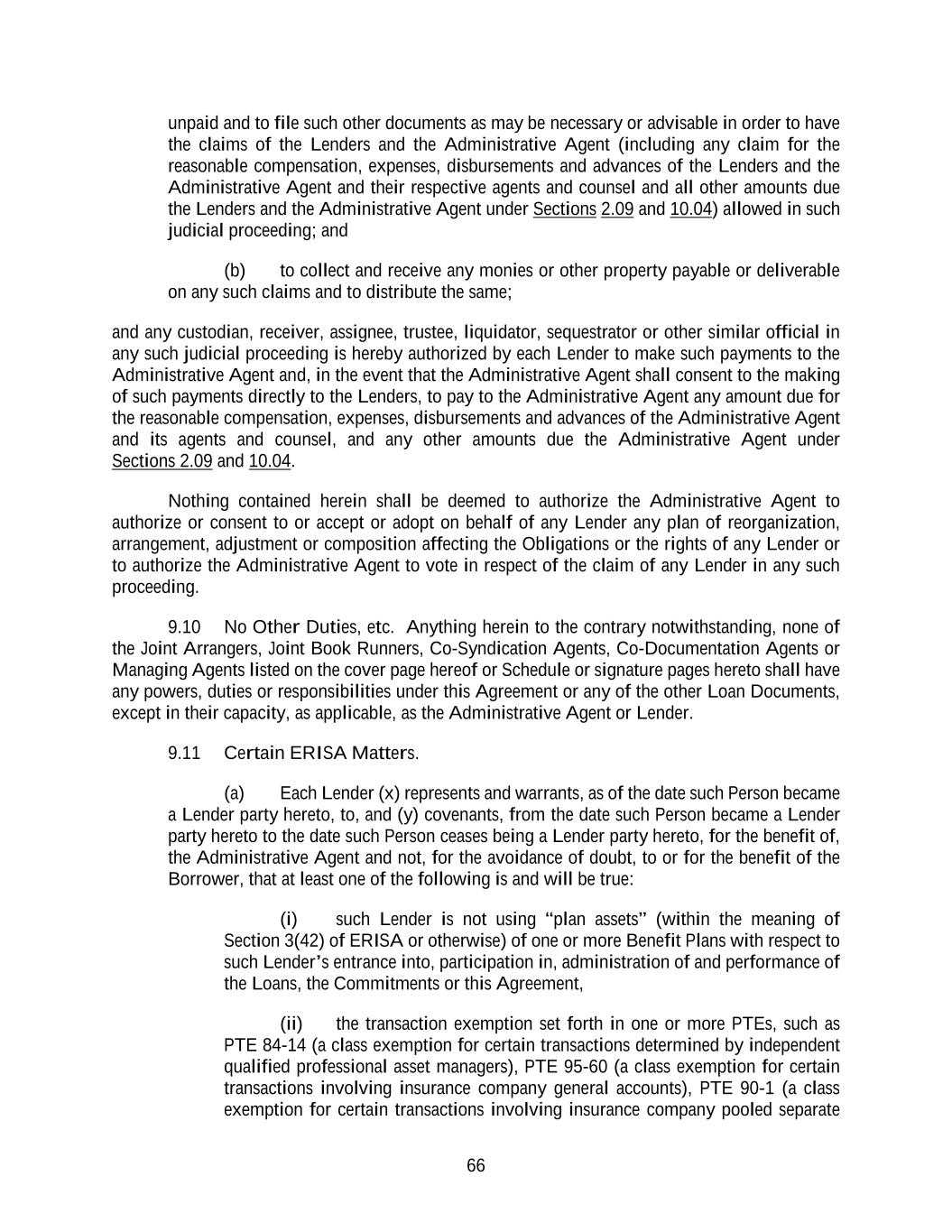 66 unpaid and to file such other documents as may be necessary or advisable in order to have the claims of the Lenders and the Administrative Agent (including any claim for the reasonable compensation, expenses, disbursements and advances of the Lenders and the Administrative Agent and their respective agents and counsel and all other amounts due the Lenders and the Administrative Agent under Sections 2.09 and 10.04) allowed in such judicial proceeding; and (b) to collect and receive any monies or other property payable or deliverable on any such claims and to distribute the same; and any custodian, receiver, assignee, trustee, liquidator, sequestrator or other similar official in any such judicial proceeding is hereby authorized by each Lender to make such payments to the Administrative Agent and, in the event that the Administrative Agent shall consent to the making of such payments directly to the Lenders, to pay to the Administrative Agent any amount due for the reasonable compensation, expenses, disbursements and advances of the Administrative Agent and its agents and counsel, and any other amounts due the Administrative Agent under Sections 2.09 and 10.04. Nothing contained herein shall be deemed to authorize the Administrative Agent to authorize or consent to or accept or adopt on behalf of any Lender any plan of reorganization, arrangement, adjustment or composition affecting the Obligations or the rights of any Lender or to authorize the Administrative Agent to vote in respect of the claim of any Lender in any such proceeding. 9.10 No Other Duties, etc. Anything herein to the contrary notwithstanding, none of the Joint Arrangers, Joint Book Runners, Co-Syndication Agents, Co-Documentation Agents or Managing Agents listed on the cover page hereof or Schedule or signature pages hereto shall have any powers, duties or responsibilities under this Agreement or any of the other Loan Documents, except in their capacity, as applicable, as the Administrative Agent or Lender. 9.11 Certain ERISA Matters. (a) Each Lender (x) represents and warrants, as of the date such Person became a Lender party hereto, to, and (y) covenants, from the date such Person became a Lender party hereto to the date such Person ceases being a Lender party hereto, for the benefit of, the Administrative Agent and not, for the avoidance of doubt, to or for the benefit of the Borrower, that at least one of the following is and will be true: (i) such Lender is not using “plan assets” (within the meaning of Section 3(42) of ERISA or otherwise) of one or more Benefit Plans with respect to such Lender’s entrance into, participation in, administration of and performance of the Loans, the Commitments or this Agreement, (ii) the transaction exemption set forth in one or more PTEs, such as PTE 84-14 (a class exemption for certain transactions determined by independent qualified professional asset managers), PTE 95-60 (a class exemption for certain transactions involving insurance company general accounts), PTE 90-1 (a class exemption for certain transactions involving insurance company pooled separate