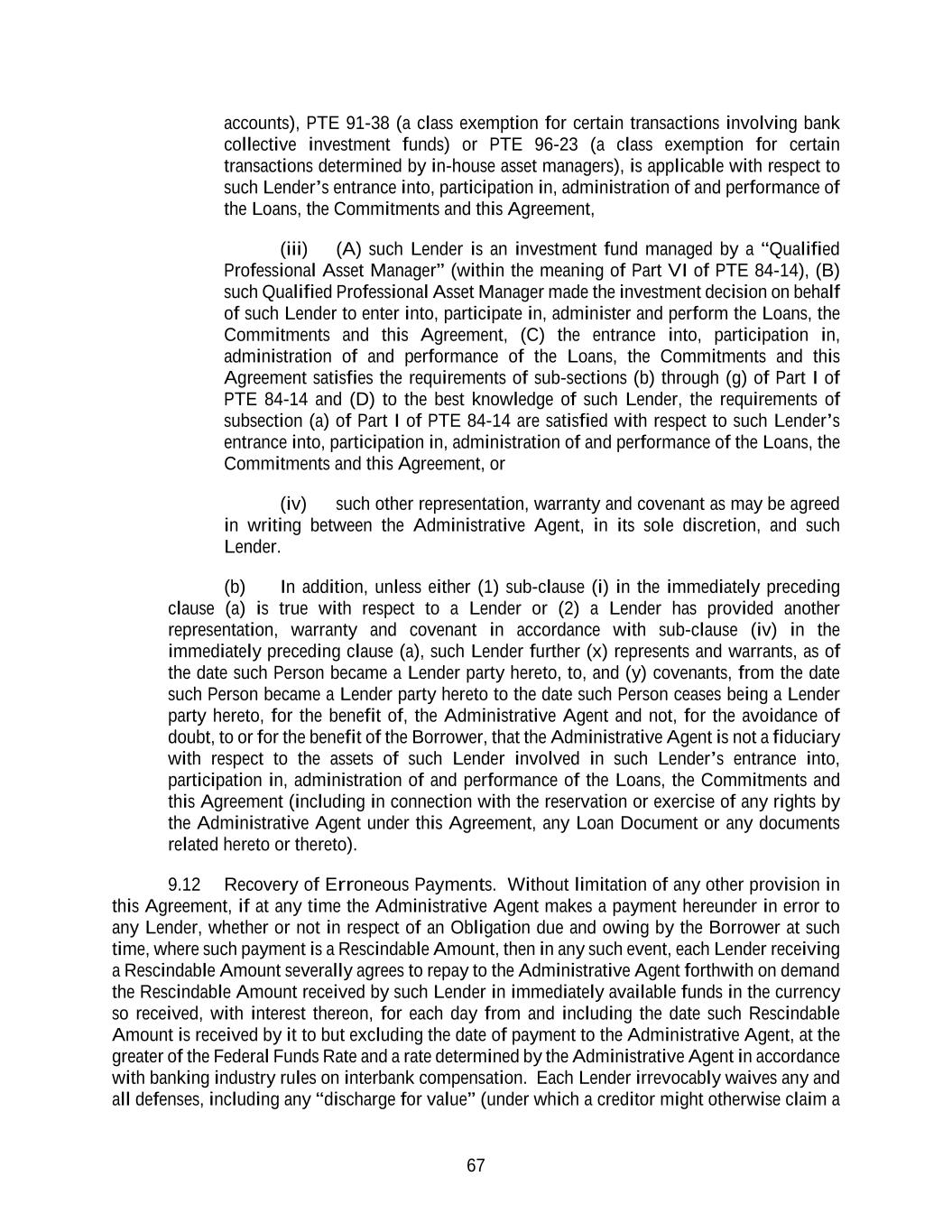 67 accounts), PTE 91-38 (a class exemption for certain transactions involving bank collective investment funds) or PTE 96-23 (a class exemption for certain transactions determined by in-house asset managers), is applicable with respect to such Lender’s entrance into, participation in, administration of and performance of the Loans, the Commitments and this Agreement, (iii) (A) such Lender is an investment fund managed by a “Qualified Professional Asset Manager” (within the meaning of Part VI of PTE 84-14), (B) such Qualified Professional Asset Manager made the investment decision on behalf of such Lender to enter into, participate in, administer and perform the Loans, the Commitments and this Agreement, (C) the entrance into, participation in, administration of and performance of the Loans, the Commitments and this Agreement satisfies the requirements of sub-sections (b) through (g) of Part I of PTE 84-14 and (D) to the best knowledge of such Lender, the requirements of subsection (a) of Part I of PTE 84-14 are satisfied with respect to such Lender’s entrance into, participation in, administration of and performance of the Loans, the Commitments and this Agreement, or (iv) such other representation, warranty and covenant as may be agreed in writing between the Administrative Agent, in its sole discretion, and such Lender. (b) In addition, unless either (1) sub-clause (i) in the immediately preceding clause (a) is true with respect to a Lender or (2) a Lender has provided another representation, warranty and covenant in accordance with sub-clause (iv) in the immediately preceding clause (a), such Lender further (x) represents and warrants, as of the date such Person became a Lender party hereto, to, and (y) covenants, from the date such Person became a Lender party hereto to the date such Person ceases being a Lender party hereto, for the benefit of, the Administrative Agent and not, for the avoidance of doubt, to or for the benefit of the Borrower, that the Administrative Agent is not a fiduciary with respect to the assets of such Lender involved in such Lender’s entrance into, participation in, administration of and performance of the Loans, the Commitments and this Agreement (including in connection with the reservation or exercise of any rights by the Administrative Agent under this Agreement, any Loan Document or any documents related hereto or thereto). 9.12 Recovery of Erroneous Payments. Without limitation of any other provision in this Agreement, if at any time the Administrative Agent makes a payment hereunder in error to any Lender, whether or not in respect of an Obligation due and owing by the Borrower at such time, where such payment is a Rescindable Amount, then in any such event, each Lender receiving a Rescindable Amount severally agrees to repay to the Administrative Agent forthwith on demand the Rescindable Amount received by such Lender in immediately available funds in the currency so received, with interest thereon, for each day from and including the date such Rescindable Amount is received by it to but excluding the date of payment to the Administrative Agent, at the greater of the Federal Funds Rate and a rate determined by the Administrative Agent in accordance with banking industry rules on interbank compensation. Each Lender irrevocably waives any and all defenses, including any “discharge for value” (under which a creditor might otherwise claim a