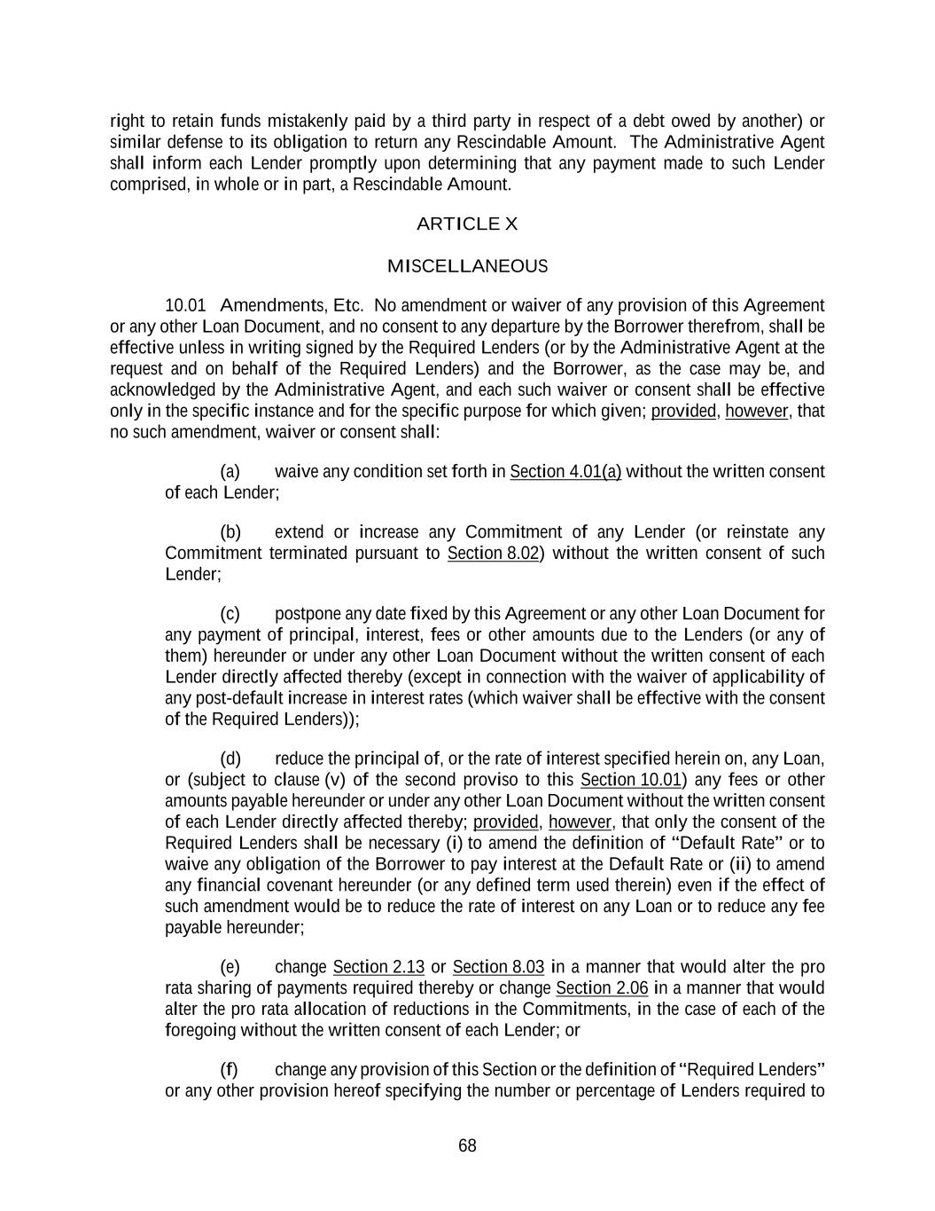 68 right to retain funds mistakenly paid by a third party in respect of a debt owed by another) or similar defense to its obligation to return any Rescindable Amount. The Administrative Agent shall inform each Lender promptly upon determining that any payment made to such Lender comprised, in whole or in part, a Rescindable Amount. ARTICLE X MISCELLANEOUS 10.01 Amendments, Etc. No amendment or waiver of any provision of this Agreement or any other Loan Document, and no consent to any departure by the Borrower therefrom, shall be effective unless in writing signed by the Required Lenders (or by the Administrative Agent at the request and on behalf of the Required Lenders) and the Borrower, as the case may be, and acknowledged by the Administrative Agent, and each such waiver or consent shall be effective only in the specific instance and for the specific purpose for which given; provided, however, that no such amendment, waiver or consent shall: (a) waive any condition set forth in Section 4.01(a) without the written consent of each Lender; (b) extend or increase any Commitment of any Lender (or reinstate any Commitment terminated pursuant to Section 8.02) without the written consent of such Lender; (c) postpone any date fixed by this Agreement or any other Loan Document for any payment of principal, interest, fees or other amounts due to the Lenders (or any of them) hereunder or under any other Loan Document without the written consent of each Lender directly affected thereby (except in connection with the waiver of applicability of any post-default increase in interest rates (which waiver shall be effective with the consent of the Required Lenders)); (d) reduce the principal of, or the rate of interest specified herein on, any Loan, or (subject to clause (v) of the second proviso to this Section 10.01) any fees or other amounts payable hereunder or under any other Loan Document without the written consent of each Lender directly affected thereby; provided, however, that only the consent of the Required Lenders shall be necessary (i) to amend the definition of “Default Rate” or to waive any obligation of the Borrower to pay interest at the Default Rate or (ii) to amend any financial covenant hereunder (or any defined term used therein) even if the effect of such amendment would be to reduce the rate of interest on any Loan or to reduce any fee payable hereunder; (e) change Section 2.13 or Section 8.03 in a manner that would alter the pro rata sharing of payments required thereby or change Section 2.06 in a manner that would alter the pro rata allocation of reductions in the Commitments, in the case of each of the foregoing without the written consent of each Lender; or (f) change any provision of this Section or the definition of “Required Lenders” or any other provision hereof specifying the number or percentage of Lenders required to