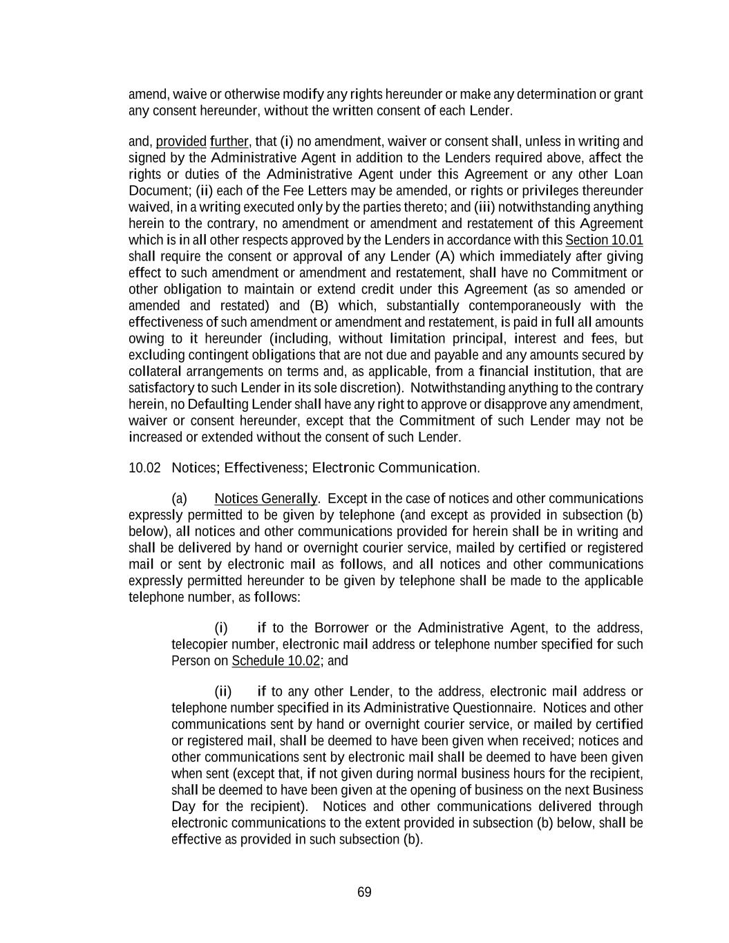 69 amend, waive or otherwise modify any rights hereunder or make any determination or grant any consent hereunder, without the written consent of each Lender. and, provided further, that (i) no amendment, waiver or consent shall, unless in writing and signed by the Administrative Agent in addition to the Lenders required above, affect the rights or duties of the Administrative Agent under this Agreement or any other Loan Document; (ii) each of the Fee Letters may be amended, or rights or privileges thereunder waived, in a writing executed only by the parties thereto; and (iii) notwithstanding anything herein to the contrary, no amendment or amendment and restatement of this Agreement which is in all other respects approved by the Lenders in accordance with this Section 10.01 shall require the consent or approval of any Lender (A) which immediately after giving effect to such amendment or amendment and restatement, shall have no Commitment or other obligation to maintain or extend credit under this Agreement (as so amended or amended and restated) and (B) which, substantially contemporaneously with the effectiveness of such amendment or amendment and restatement, is paid in full all amounts owing to it hereunder (including, without limitation principal, interest and fees, but excluding contingent obligations that are not due and payable and any amounts secured by collateral arrangements on terms and, as applicable, from a financial institution, that are satisfactory to such Lender in its sole discretion). Notwithstanding anything to the contrary herein, no Defaulting Lender shall have any right to approve or disapprove any amendment, waiver or consent hereunder, except that the Commitment of such Lender may not be increased or extended without the consent of such Lender. 10.02 Notices; Effectiveness; Electronic Communication. (a) Notices Generally. Except in the case of notices and other communications expressly permitted to be given by telephone (and except as provided in subsection (b) below), all notices and other communications provided for herein shall be in writing and shall be delivered by hand or overnight courier service, mailed by certified or registered mail or sent by electronic mail as follows, and all notices and other communications expressly permitted hereunder to be given by telephone shall be made to the applicable telephone number, as follows: (i) if to the Borrower or the Administrative Agent, to the address, telecopier number, electronic mail address or telephone number specified for such Person on Schedule 10.02; and (ii) if to any other Lender, to the address, electronic mail address or telephone number specified in its Administrative Questionnaire. Notices and other communications sent by hand or overnight courier service, or mailed by certified or registered mail, shall be deemed to have been given when received; notices and other communications sent by electronic mail shall be deemed to have been given when sent (except that, if not given during normal business hours for the recipient, shall be deemed to have been given at the opening of business on the next Business Day for the recipient). Notices and other communications delivered through electronic communications to the extent provided in subsection (b) below, shall be effective as provided in such subsection (b).