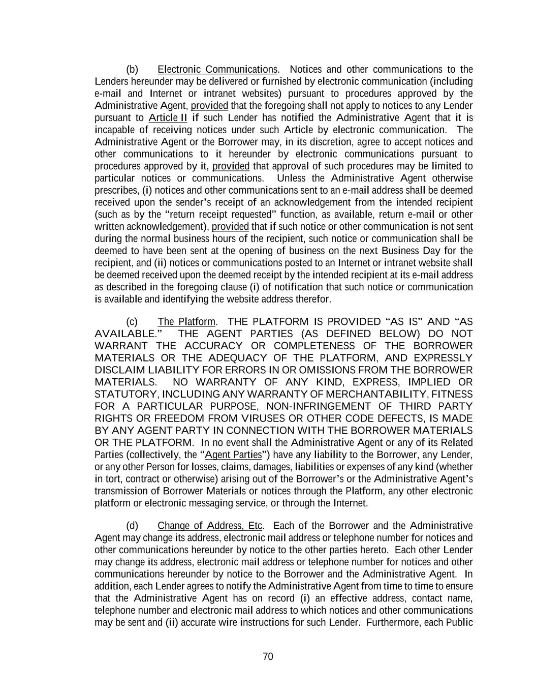 70 (b) Electronic Communications. Notices and other communications to the Lenders hereunder may be delivered or furnished by electronic communication (including e-mail and Internet or intranet websites) pursuant to procedures approved by the Administrative Agent, provided that the foregoing shall not apply to notices to any Lender pursuant to Article II if such Lender has notified the Administrative Agent that it is incapable of receiving notices under such Article by electronic communication. The Administrative Agent or the Borrower may, in its discretion, agree to accept notices and other communications to it hereunder by electronic communications pursuant to procedures approved by it, provided that approval of such procedures may be limited to particular notices or communications. Unless the Administrative Agent otherwise prescribes, (i) notices and other communications sent to an e-mail address shall be deemed received upon the sender’s receipt of an acknowledgement from the intended recipient (such as by the “return receipt requested” function, as available, return e-mail or other written acknowledgement), provided that if such notice or other communication is not sent during the normal business hours of the recipient, such notice or communication shall be deemed to have been sent at the opening of business on the next Business Day for the recipient, and (ii) notices or communications posted to an Internet or intranet website shall be deemed received upon the deemed receipt by the intended recipient at its e-mail address as described in the foregoing clause (i) of notification that such notice or communication is available and identifying the website address therefor. (c) The Platform. THE PLATFORM IS PROVIDED “AS IS” AND “AS AVAILABLE.” THE AGENT PARTIES (AS DEFINED BELOW) DO NOT WARRANT THE ACCURACY OR COMPLETENESS OF THE BORROWER MATERIALS OR THE ADEQUACY OF THE PLATFORM, AND EXPRESSLY DISCLAIM LIABILITY FOR ERRORS IN OR OMISSIONS FROM THE BORROWER MATERIALS. NO WARRANTY OF ANY KIND, EXPRESS, IMPLIED OR STATUTORY, INCLUDING ANY WARRANTY OF MERCHANTABILITY, FITNESS FOR A PARTICULAR PURPOSE, NON-INFRINGEMENT OF THIRD PARTY RIGHTS OR FREEDOM FROM VIRUSES OR OTHER CODE DEFECTS, IS MADE BY ANY AGENT PARTY IN CONNECTION WITH THE BORROWER MATERIALS OR THE PLATFORM. In no event shall the Administrative Agent or any of its Related Parties (collectively, the “Agent Parties”) have any liability to the Borrower, any Lender, or any other Person for losses, claims, damages, liabilities or expenses of any kind (whether in tort, contract or otherwise) arising out of the Borrower’s or the Administrative Agent’s transmission of Borrower Materials or notices through the Platform, any other electronic platform or electronic messaging service, or through the Internet. (d) Change of Address, Etc. Each of the Borrower and the Administrative Agent may change its address, electronic mail address or telephone number for notices and other communications hereunder by notice to the other parties hereto. Each other Lender may change its address, electronic mail address or telephone number for notices and other communications hereunder by notice to the Borrower and the Administrative Agent. In addition, each Lender agrees to notify the Administrative Agent from time to time to ensure that the Administrative Agent has on record (i) an effective address, contact name, telephone number and electronic mail address to which notices and other communications may be sent and (ii) accurate wire instructions for such Lender. Furthermore, each Public