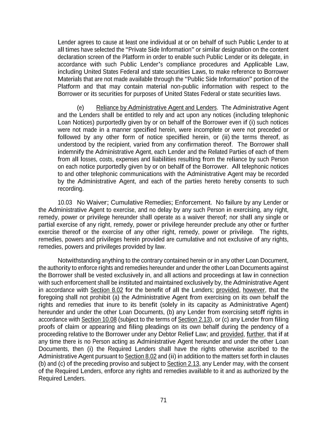 71 Lender agrees to cause at least one individual at or on behalf of such Public Lender to at all times have selected the “Private Side Information” or similar designation on the content declaration screen of the Platform in order to enable such Public Lender or its delegate, in accordance with such Public Lender’s compliance procedures and Applicable Law, including United States Federal and state securities Laws, to make reference to Borrower Materials that are not made available through the “Public Side Information” portion of the Platform and that may contain material non-public information with respect to the Borrower or its securities for purposes of United States Federal or state securities laws. (e) Reliance by Administrative Agent and Lenders. The Administrative Agent and the Lenders shall be entitled to rely and act upon any notices (including telephonic Loan Notices) purportedly given by or on behalf of the Borrower even if (i) such notices were not made in a manner specified herein, were incomplete or were not preceded or followed by any other form of notice specified herein, or (ii) the terms thereof, as understood by the recipient, varied from any confirmation thereof. The Borrower shall indemnify the Administrative Agent, each Lender and the Related Parties of each of them from all losses, costs, expenses and liabilities resulting from the reliance by such Person on each notice purportedly given by or on behalf of the Borrower. All telephonic notices to and other telephonic communications with the Administrative Agent may be recorded by the Administrative Agent, and each of the parties hereto hereby consents to such recording. 10.03 No Waiver; Cumulative Remedies; Enforcement. No failure by any Lender or the Administrative Agent to exercise, and no delay by any such Person in exercising, any right, remedy, power or privilege hereunder shall operate as a waiver thereof; nor shall any single or partial exercise of any right, remedy, power or privilege hereunder preclude any other or further exercise thereof or the exercise of any other right, remedy, power or privilege. The rights, remedies, powers and privileges herein provided are cumulative and not exclusive of any rights, remedies, powers and privileges provided by law. Notwithstanding anything to the contrary contained herein or in any other Loan Document, the authority to enforce rights and remedies hereunder and under the other Loan Documents against the Borrower shall be vested exclusively in, and all actions and proceedings at law in connection with such enforcement shall be instituted and maintained exclusively by, the Administrative Agent in accordance with Section 8.02 for the benefit of all the Lenders; provided, however, that the foregoing shall not prohibit (a) the Administrative Agent from exercising on its own behalf the rights and remedies that inure to its benefit (solely in its capacity as Administrative Agent) hereunder and under the other Loan Documents, (b) any Lender from exercising setoff rights in accordance with Section 10.08 (subject to the terms of Section 2.13), or (c) any Lender from filing proofs of claim or appearing and filing pleadings on its own behalf during the pendency of a proceeding relative to the Borrower under any Debtor Relief Law; and provided, further, that if at any time there is no Person acting as Administrative Agent hereunder and under the other Loan Documents, then (i) the Required Lenders shall have the rights otherwise ascribed to the Administrative Agent pursuant to Section 8.02 and (ii) in addition to the matters set forth in clauses (b) and (c) of the preceding proviso and subject to Section 2.13, any Lender may, with the consent of the Required Lenders, enforce any rights and remedies available to it and as authorized by the Required Lenders.