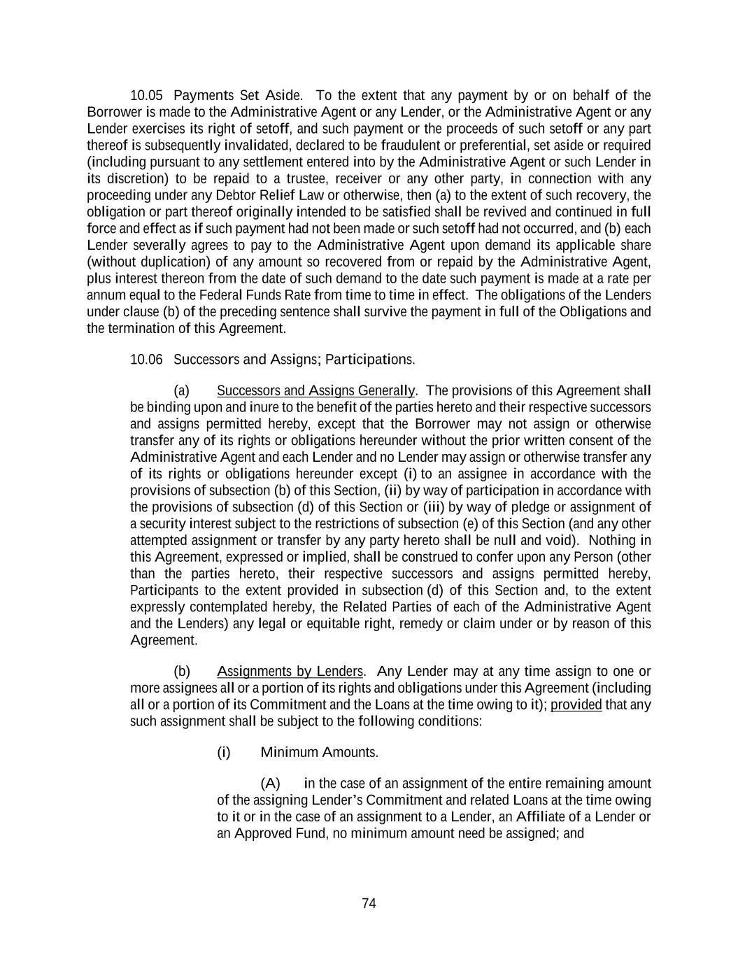 74 10.05 Payments Set Aside. To the extent that any payment by or on behalf of the Borrower is made to the Administrative Agent or any Lender, or the Administrative Agent or any Lender exercises its right of setoff, and such payment or the proceeds of such setoff or any part thereof is subsequently invalidated, declared to be fraudulent or preferential, set aside or required (including pursuant to any settlement entered into by the Administrative Agent or such Lender in its discretion) to be repaid to a trustee, receiver or any other party, in connection with any proceeding under any Debtor Relief Law or otherwise, then (a) to the extent of such recovery, the obligation or part thereof originally intended to be satisfied shall be revived and continued in full force and effect as if such payment had not been made or such setoff had not occurred, and (b) each Lender severally agrees to pay to the Administrative Agent upon demand its applicable share (without duplication) of any amount so recovered from or repaid by the Administrative Agent, plus interest thereon from the date of such demand to the date such payment is made at a rate per annum equal to the Federal Funds Rate from time to time in effect. The obligations of the Lenders under clause (b) of the preceding sentence shall survive the payment in full of the Obligations and the termination of this Agreement. 10.06 Successors and Assigns; Participations. (a) Successors and Assigns Generally. The provisions of this Agreement shall be binding upon and inure to the benefit of the parties hereto and their respective successors and assigns permitted hereby, except that the Borrower may not assign or otherwise transfer any of its rights or obligations hereunder without the prior written consent of the Administrative Agent and each Lender and no Lender may assign or otherwise transfer any of its rights or obligations hereunder except (i) to an assignee in accordance with the provisions of subsection (b) of this Section, (ii) by way of participation in accordance with the provisions of subsection (d) of this Section or (iii) by way of pledge or assignment of a security interest subject to the restrictions of subsection (e) of this Section (and any other attempted assignment or transfer by any party hereto shall be null and void). Nothing in this Agreement, expressed or implied, shall be construed to confer upon any Person (other than the parties hereto, their respective successors and assigns permitted hereby, Participants to the extent provided in subsection (d) of this Section and, to the extent expressly contemplated hereby, the Related Parties of each of the Administrative Agent and the Lenders) any legal or equitable right, remedy or claim under or by reason of this Agreement. (b) Assignments by Lenders. Any Lender may at any time assign to one or more assignees all or a portion of its rights and obligations under this Agreement (including all or a portion of its Commitment and the Loans at the time owing to it); provided that any such assignment shall be subject to the following conditions: (i) Minimum Amounts. (A) in the case of an assignment of the entire remaining amount of the assigning Lender’s Commitment and related Loans at the time owing to it or in the case of an assignment to a Lender, an Affiliate of a Lender or an Approved Fund, no minimum amount need be assigned; and