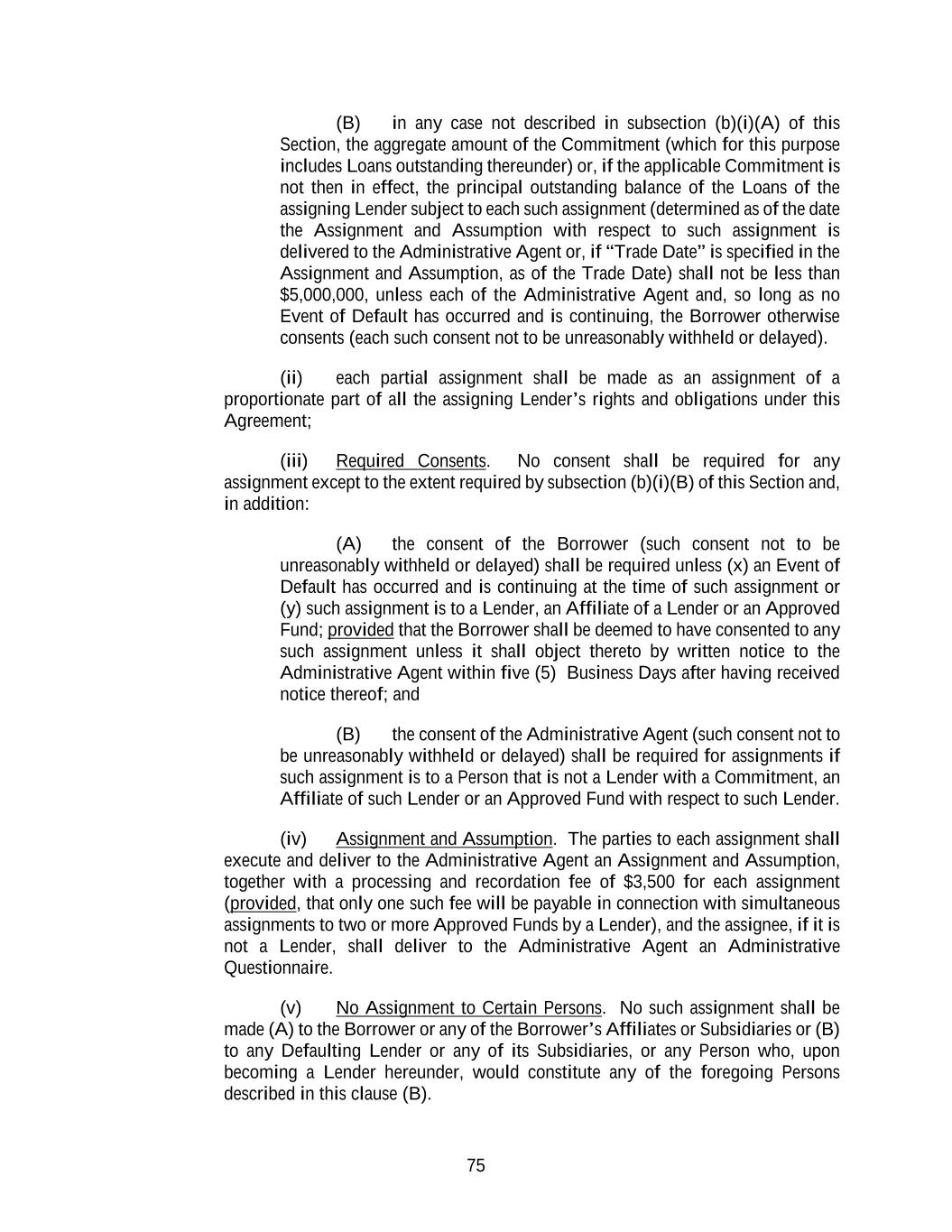 75 (B) in any case not described in subsection (b)(i)(A) of this Section, the aggregate amount of the Commitment (which for this purpose includes Loans outstanding thereunder) or, if the applicable Commitment is not then in effect, the principal outstanding balance of the Loans of the assigning Lender subject to each such assignment (determined as of the date the Assignment and Assumption with respect to such assignment is delivered to the Administrative Agent or, if “Trade Date” is specified in the Assignment and Assumption, as of the Trade Date) shall not be less than $5,000,000, unless each of the Administrative Agent and, so long as no Event of Default has occurred and is continuing, the Borrower otherwise consents (each such consent not to be unreasonably withheld or delayed). (ii) each partial assignment shall be made as an assignment of a proportionate part of all the assigning Lender’s rights and obligations under this Agreement; (iii) Required Consents. No consent shall be required for any assignment except to the extent required by subsection (b)(i)(B) of this Section and, in addition: (A) the consent of the Borrower (such consent not to be unreasonably withheld or delayed) shall be required unless (x) an Event of Default has occurred and is continuing at the time of such assignment or (y) such assignment is to a Lender, an Affiliate of a Lender or an Approved Fund; provided that the Borrower shall be deemed to have consented to any such assignment unless it shall object thereto by written notice to the Administrative Agent within five (5) Business Days after having received notice thereof; and (B) the consent of the Administrative Agent (such consent not to be unreasonably withheld or delayed) shall be required for assignments if such assignment is to a Person that is not a Lender with a Commitment, an Affiliate of such Lender or an Approved Fund with respect to such Lender. (iv) Assignment and Assumption. The parties to each assignment shall execute and deliver to the Administrative Agent an Assignment and Assumption, together with a processing and recordation fee of $3,500 for each assignment (provided, that only one such fee will be payable in connection with simultaneous assignments to two or more Approved Funds by a Lender), and the assignee, if it is not a Lender, shall deliver to the Administrative Agent an Administrative Questionnaire. (v) No Assignment to Certain Persons. No such assignment shall be made (A) to the Borrower or any of the Borrower’s Affiliates or Subsidiaries or (B) to any Defaulting Lender or any of its Subsidiaries, or any Person who, upon becoming a Lender hereunder, would constitute any of the foregoing Persons described in this clause (B).