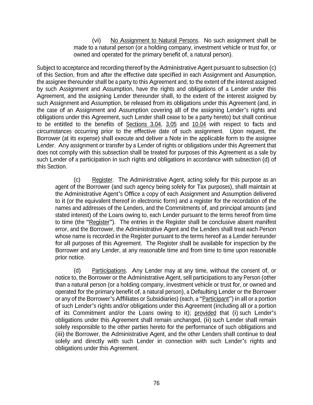 76 (vi) No Assignment to Natural Persons. No such assignment shall be made to a natural person (or a holding company, investment vehicle or trust for, or owned and operated for the primary benefit of, a natural person). Subject to acceptance and recording thereof by the Administrative Agent pursuant to subsection (c) of this Section, from and after the effective date specified in each Assignment and Assumption, the assignee thereunder shall be a party to this Agreement and, to the extent of the interest assigned by such Assignment and Assumption, have the rights and obligations of a Lender under this Agreement, and the assigning Lender thereunder shall, to the extent of the interest assigned by such Assignment and Assumption, be released from its obligations under this Agreement (and, in the case of an Assignment and Assumption covering all of the assigning Lender’s rights and obligations under this Agreement, such Lender shall cease to be a party hereto) but shall continue to be entitled to the benefits of Sections 3.04, 3.05 and 10.04 with respect to facts and circumstances occurring prior to the effective date of such assignment. Upon request, the Borrower (at its expense) shall execute and deliver a Note in the applicable form to the assignee Lender. Any assignment or transfer by a Lender of rights or obligations under this Agreement that does not comply with this subsection shall be treated for purposes of this Agreement as a sale by such Lender of a participation in such rights and obligations in accordance with subsection (d) of this Section. (c) Register. The Administrative Agent, acting solely for this purpose as an agent of the Borrower (and such agency being solely for Tax purposes), shall maintain at the Administrative Agent’s Office a copy of each Assignment and Assumption delivered to it (or the equivalent thereof in electronic form) and a register for the recordation of the names and addresses of the Lenders, and the Commitments of, and principal amounts (and stated interest) of the Loans owing to, each Lender pursuant to the terms hereof from time to time (the “Register”). The entries in the Register shall be conclusive absent manifest error, and the Borrower, the Administrative Agent and the Lenders shall treat each Person whose name is recorded in the Register pursuant to the terms hereof as a Lender hereunder for all purposes of this Agreement. The Register shall be available for inspection by the Borrower and any Lender, at any reasonable time and from time to time upon reasonable prior notice. (d) Participations. Any Lender may at any time, without the consent of, or notice to, the Borrower or the Administrative Agent, sell participations to any Person (other than a natural person (or a holding company, investment vehicle or trust for, or owned and operated for the primary benefit of, a natural person), a Defaulting Lender or the Borrower or any of the Borrower’s Affiliates or Subsidiaries) (each, a “Participant”) in all or a portion of such Lender’s rights and/or obligations under this Agreement (including all or a portion of its Commitment and/or the Loans owing to it); provided that (i) such Lender’s obligations under this Agreement shall remain unchanged, (ii) such Lender shall remain solely responsible to the other parties hereto for the performance of such obligations and (iii) the Borrower, the Administrative Agent, and the other Lenders shall continue to deal solely and directly with such Lender in connection with such Lender’s rights and obligations under this Agreement.