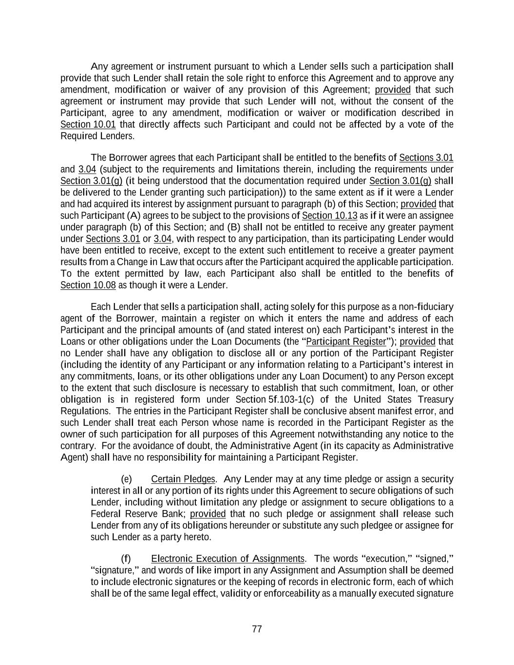 77 Any agreement or instrument pursuant to which a Lender sells such a participation shall provide that such Lender shall retain the sole right to enforce this Agreement and to approve any amendment, modification or waiver of any provision of this Agreement; provided that such agreement or instrument may provide that such Lender will not, without the consent of the Participant, agree to any amendment, modification or waiver or modification described in Section 10.01 that directly affects such Participant and could not be affected by a vote of the Required Lenders. The Borrower agrees that each Participant shall be entitled to the benefits of Sections 3.01 and 3.04 (subject to the requirements and limitations therein, including the requirements under Section 3.01(g) (it being understood that the documentation required under Section 3.01(g) shall be delivered to the Lender granting such participation)) to the same extent as if it were a Lender and had acquired its interest by assignment pursuant to paragraph (b) of this Section; provided that such Participant (A) agrees to be subject to the provisions of Section 10.13 as if it were an assignee under paragraph (b) of this Section; and (B) shall not be entitled to receive any greater payment under Sections 3.01 or 3.04, with respect to any participation, than its participating Lender would have been entitled to receive, except to the extent such entitlement to receive a greater payment results from a Change in Law that occurs after the Participant acquired the applicable participation. To the extent permitted by law, each Participant also shall be entitled to the benefits of Section 10.08 as though it were a Lender. Each Lender that sells a participation shall, acting solely for this purpose as a non-fiduciary agent of the Borrower, maintain a register on which it enters the name and address of each Participant and the principal amounts of (and stated interest on) each Participant’s interest in the Loans or other obligations under the Loan Documents (the “Participant Register”); provided that no Lender shall have any obligation to disclose all or any portion of the Participant Register (including the identity of any Participant or any information relating to a Participant’s interest in any commitments, loans, or its other obligations under any Loan Document) to any Person except to the extent that such disclosure is necessary to establish that such commitment, loan, or other obligation is in registered form under Section 5f.103-1(c) of the United States Treasury Regulations. The entries in the Participant Register shall be conclusive absent manifest error, and such Lender shall treat each Person whose name is recorded in the Participant Register as the owner of such participation for all purposes of this Agreement notwithstanding any notice to the contrary. For the avoidance of doubt, the Administrative Agent (in its capacity as Administrative Agent) shall have no responsibility for maintaining a Participant Register. (e) Certain Pledges. Any Lender may at any time pledge or assign a security interest in all or any portion of its rights under this Agreement to secure obligations of such Lender, including without limitation any pledge or assignment to secure obligations to a Federal Reserve Bank; provided that no such pledge or assignment shall release such Lender from any of its obligations hereunder or substitute any such pledgee or assignee for such Lender as a party hereto. (f) Electronic Execution of Assignments. The words “execution,” “signed,” “signature,” and words of like import in any Assignment and Assumption shall be deemed to include electronic signatures or the keeping of records in electronic form, each of which shall be of the same legal effect, validity or enforceability as a manually executed signature