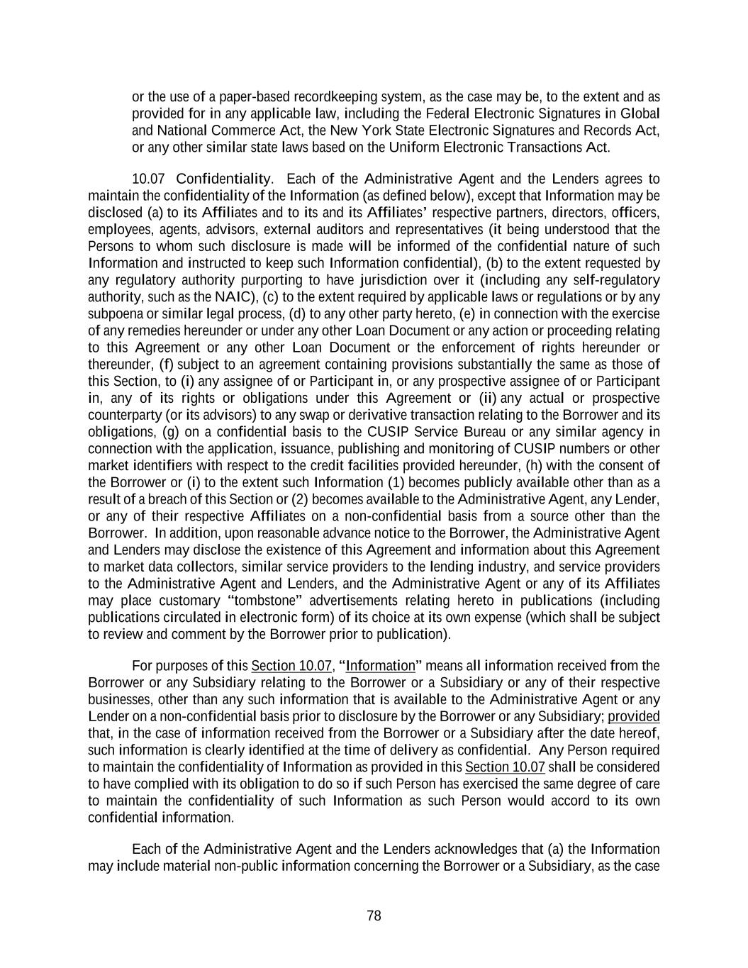 78 or the use of a paper-based recordkeeping system, as the case may be, to the extent and as provided for in any applicable law, including the Federal Electronic Signatures in Global and National Commerce Act, the New York State Electronic Signatures and Records Act, or any other similar state laws based on the Uniform Electronic Transactions Act. 10.07 Confidentiality. Each of the Administrative Agent and the Lenders agrees to maintain the confidentiality of the Information (as defined below), except that Information may be disclosed (a) to its Affiliates and to its and its Affiliates’ respective partners, directors, officers, employees, agents, advisors, external auditors and representatives (it being understood that the Persons to whom such disclosure is made will be informed of the confidential nature of such Information and instructed to keep such Information confidential), (b) to the extent requested by any regulatory authority purporting to have jurisdiction over it (including any self-regulatory authority, such as the NAIC), (c) to the extent required by applicable laws or regulations or by any subpoena or similar legal process, (d) to any other party hereto, (e) in connection with the exercise of any remedies hereunder or under any other Loan Document or any action or proceeding relating to this Agreement or any other Loan Document or the enforcement of rights hereunder or thereunder, (f) subject to an agreement containing provisions substantially the same as those of this Section, to (i) any assignee of or Participant in, or any prospective assignee of or Participant in, any of its rights or obligations under this Agreement or (ii) any actual or prospective counterparty (or its advisors) to any swap or derivative transaction relating to the Borrower and its obligations, (g) on a confidential basis to the CUSIP Service Bureau or any similar agency in connection with the application, issuance, publishing and monitoring of CUSIP numbers or other market identifiers with respect to the credit facilities provided hereunder, (h) with the consent of the Borrower or (i) to the extent such Information (1) becomes publicly available other than as a result of a breach of this Section or (2) becomes available to the Administrative Agent, any Lender, or any of their respective Affiliates on a non-confidential basis from a source other than the Borrower. In addition, upon reasonable advance notice to the Borrower, the Administrative Agent and Lenders may disclose the existence of this Agreement and information about this Agreement to market data collectors, similar service providers to the lending industry, and service providers to the Administrative Agent and Lenders, and the Administrative Agent or any of its Affiliates may place customary “tombstone” advertisements relating hereto in publications (including publications circulated in electronic form) of its choice at its own expense (which shall be subject to review and comment by the Borrower prior to publication). For purposes of this Section 10.07, “Information” means all information received from the Borrower or any Subsidiary relating to the Borrower or a Subsidiary or any of their respective businesses, other than any such information that is available to the Administrative Agent or any Lender on a non-confidential basis prior to disclosure by the Borrower or any Subsidiary; provided that, in the case of information received from the Borrower or a Subsidiary after the date hereof, such information is clearly identified at the time of delivery as confidential. Any Person required to maintain the confidentiality of Information as provided in this Section 10.07 shall be considered to have complied with its obligation to do so if such Person has exercised the same degree of care to maintain the confidentiality of such Information as such Person would accord to its own confidential information. Each of the Administrative Agent and the Lenders acknowledges that (a) the Information may include material non-public information concerning the Borrower or a Subsidiary, as the case