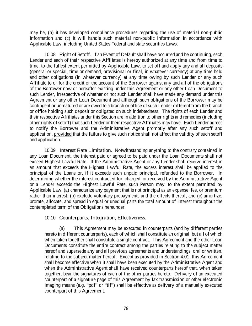 79 may be, (b) it has developed compliance procedures regarding the use of material non-public information and (c) it will handle such material non-public information in accordance with Applicable Law, including United States Federal and state securities Laws. 10.08 Right of Setoff. If an Event of Default shall have occurred and be continuing, each Lender and each of their respective Affiliates is hereby authorized at any time and from time to time, to the fullest extent permitted by Applicable Law, to set off and apply any and all deposits (general or special, time or demand, provisional or final, in whatever currency) at any time held and other obligations (in whatever currency) at any time owing by such Lender or any such Affiliate to or for the credit or the account of the Borrower against any and all of the obligations of the Borrower now or hereafter existing under this Agreement or any other Loan Document to such Lender, irrespective of whether or not such Lender shall have made any demand under this Agreement or any other Loan Document and although such obligations of the Borrower may be contingent or unmatured or are owed to a branch or office of such Lender different from the branch or office holding such deposit or obligated on such indebtedness. The rights of each Lender and their respective Affiliates under this Section are in addition to other rights and remedies (including other rights of setoff) that such Lender or their respective Affiliates may have. Each Lender agrees to notify the Borrower and the Administrative Agent promptly after any such setoff and application, provided that the failure to give such notice shall not affect the validity of such setoff and application. 10.09 Interest Rate Limitation. Notwithstanding anything to the contrary contained in any Loan Document, the interest paid or agreed to be paid under the Loan Documents shall not exceed Highest Lawful Rate. If the Administrative Agent or any Lender shall receive interest in an amount that exceeds the Highest Lawful Rate, the excess interest shall be applied to the principal of the Loans or, if it exceeds such unpaid principal, refunded to the Borrower. In determining whether the interest contracted for, charged, or received by the Administrative Agent or a Lender exceeds the Highest Lawful Rate, such Person may, to the extent permitted by Applicable Law, (a) characterize any payment that is not principal as an expense, fee, or premium rather than interest, (b) exclude voluntary prepayments and the effects thereof, and (c) amortize, prorate, allocate, and spread in equal or unequal parts the total amount of interest throughout the contemplated term of the Obligations hereunder. 10.10 Counterparts; Integration; Effectiveness. (a) This Agreement may be executed in counterparts (and by different parties hereto in different counterparts), each of which shall constitute an original, but all of which when taken together shall constitute a single contract. This Agreement and the other Loan Documents constitute the entire contract among the parties relating to the subject matter hereof and supersede any and all previous agreements and understandings, oral or written, relating to the subject matter hereof. Except as provided in Section 4.01, this Agreement shall become effective when it shall have been executed by the Administrative Agent and when the Administrative Agent shall have received counterparts hereof that, when taken together, bear the signatures of each of the other parties hereto. Delivery of an executed counterpart of a signature page of this Agreement by fax transmission or other electronic imaging means (e.g. “pdf” or “tif”) shall be effective as delivery of a manually executed counterpart of this Agreement.