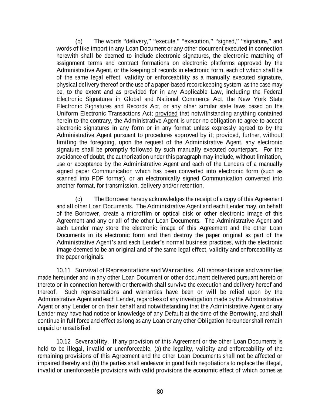 80 (b) The words “delivery,” “execute,” “execution,” “signed,” “signature,” and words of like import in any Loan Document or any other document executed in connection herewith shall be deemed to include electronic signatures, the electronic matching of assignment terms and contract formations on electronic platforms approved by the Administrative Agent, or the keeping of records in electronic form, each of which shall be of the same legal effect, validity or enforceability as a manually executed signature, physical delivery thereof or the use of a paper-based recordkeeping system, as the case may be, to the extent and as provided for in any Applicable Law, including the Federal Electronic Signatures in Global and National Commerce Act, the New York State Electronic Signatures and Records Act, or any other similar state laws based on the Uniform Electronic Transactions Act; provided that notwithstanding anything contained herein to the contrary, the Administrative Agent is under no obligation to agree to accept electronic signatures in any form or in any format unless expressly agreed to by the Administrative Agent pursuant to procedures approved by it; provided, further, without limiting the foregoing, upon the request of the Administrative Agent, any electronic signature shall be promptly followed by such manually executed counterpart. For the avoidance of doubt, the authorization under this paragraph may include, without limitation, use or acceptance by the Administrative Agent and each of the Lenders of a manually signed paper Communication which has been converted into electronic form (such as scanned into PDF format), or an electronically signed Communication converted into another format, for transmission, delivery and/or retention. (c) The Borrower hereby acknowledges the receipt of a copy of this Agreement and all other Loan Documents. The Administrative Agent and each Lender may, on behalf of the Borrower, create a microfilm or optical disk or other electronic image of this Agreement and any or all of the other Loan Documents. The Administrative Agent and each Lender may store the electronic image of this Agreement and the other Loan Documents in its electronic form and then destroy the paper original as part of the Administrative Agent’s and each Lender’s normal business practices, with the electronic image deemed to be an original and of the same legal effect, validity and enforceability as the paper originals. 10.11 Survival of Representations and Warranties. All representations and warranties made hereunder and in any other Loan Document or other document delivered pursuant hereto or thereto or in connection herewith or therewith shall survive the execution and delivery hereof and thereof. Such representations and warranties have been or will be relied upon by the Administrative Agent and each Lender, regardless of any investigation made by the Administrative Agent or any Lender or on their behalf and notwithstanding that the Administrative Agent or any Lender may have had notice or knowledge of any Default at the time of the Borrowing, and shall continue in full force and effect as long as any Loan or any other Obligation hereunder shall remain unpaid or unsatisfied. 10.12 Severability. If any provision of this Agreement or the other Loan Documents is held to be illegal, invalid or unenforceable, (a) the legality, validity and enforceability of the remaining provisions of this Agreement and the other Loan Documents shall not be affected or impaired thereby and (b) the parties shall endeavor in good faith negotiations to replace the illegal, invalid or unenforceable provisions with valid provisions the economic effect of which comes as
