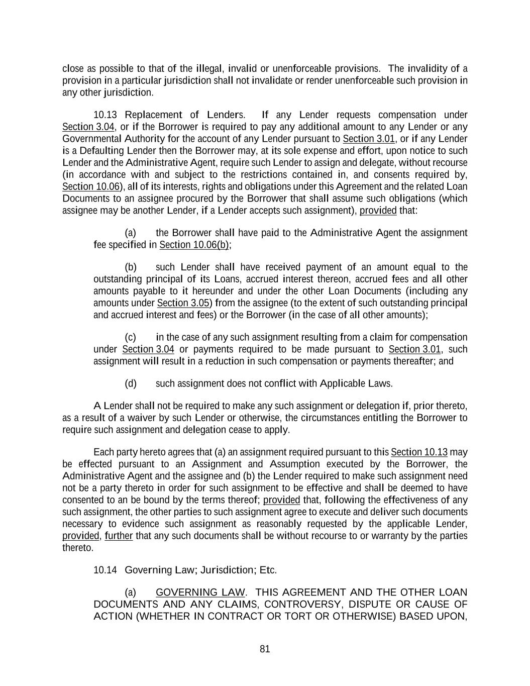 81 close as possible to that of the illegal, invalid or unenforceable provisions. The invalidity of a provision in a particular jurisdiction shall not invalidate or render unenforceable such provision in any other jurisdiction. 10.13 Replacement of Lenders. If any Lender requests compensation under Section 3.04, or if the Borrower is required to pay any additional amount to any Lender or any Governmental Authority for the account of any Lender pursuant to Section 3.01, or if any Lender is a Defaulting Lender then the Borrower may, at its sole expense and effort, upon notice to such Lender and the Administrative Agent, require such Lender to assign and delegate, without recourse (in accordance with and subject to the restrictions contained in, and consents required by, Section 10.06), all of its interests, rights and obligations under this Agreement and the related Loan Documents to an assignee procured by the Borrower that shall assume such obligations (which assignee may be another Lender, if a Lender accepts such assignment), provided that: (a) the Borrower shall have paid to the Administrative Agent the assignment fee specified in Section 10.06(b); (b) such Lender shall have received payment of an amount equal to the outstanding principal of its Loans, accrued interest thereon, accrued fees and all other amounts payable to it hereunder and under the other Loan Documents (including any amounts under Section 3.05) from the assignee (to the extent of such outstanding principal and accrued interest and fees) or the Borrower (in the case of all other amounts); (c) in the case of any such assignment resulting from a claim for compensation under Section 3.04 or payments required to be made pursuant to Section 3.01, such assignment will result in a reduction in such compensation or payments thereafter; and (d) such assignment does not conflict with Applicable Laws. A Lender shall not be required to make any such assignment or delegation if, prior thereto, as a result of a waiver by such Lender or otherwise, the circumstances entitling the Borrower to require such assignment and delegation cease to apply. Each party hereto agrees that (a) an assignment required pursuant to this Section 10.13 may be effected pursuant to an Assignment and Assumption executed by the Borrower, the Administrative Agent and the assignee and (b) the Lender required to make such assignment need not be a party thereto in order for such assignment to be effective and shall be deemed to have consented to an be bound by the terms thereof; provided that, following the effectiveness of any such assignment, the other parties to such assignment agree to execute and deliver such documents necessary to evidence such assignment as reasonably requested by the applicable Lender, provided, further that any such documents shall be without recourse to or warranty by the parties thereto. 10.14 Governing Law; Jurisdiction; Etc. (a) GOVERNING LAW. THIS AGREEMENT AND THE OTHER LOAN DOCUMENTS AND ANY CLAIMS, CONTROVERSY, DISPUTE OR CAUSE OF ACTION (WHETHER IN CONTRACT OR TORT OR OTHERWISE) BASED UPON,