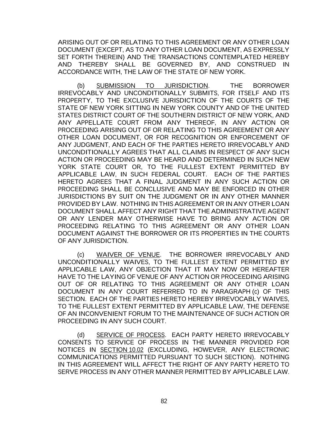 82 ARISING OUT OF OR RELATING TO THIS AGREEMENT OR ANY OTHER LOAN DOCUMENT (EXCEPT, AS TO ANY OTHER LOAN DOCUMENT, AS EXPRESSLY SET FORTH THEREIN) AND THE TRANSACTIONS CONTEMPLATED HEREBY AND THEREBY SHALL BE GOVERNED BY, AND CONSTRUED IN ACCORDANCE WITH, THE LAW OF THE STATE OF NEW YORK. (b) SUBMISSION TO JURISDICTION. THE BORROWER IRREVOCABLY AND UNCONDITIONALLY SUBMITS, FOR ITSELF AND ITS PROPERTY, TO THE EXCLUSIVE JURISDICTION OF THE COURTS OF THE STATE OF NEW YORK SITTING IN NEW YORK COUNTY AND OF THE UNITED STATES DISTRICT COURT OF THE SOUTHERN DISTRICT OF NEW YORK, AND ANY APPELLATE COURT FROM ANY THEREOF, IN ANY ACTION OR PROCEEDING ARISING OUT OF OR RELATING TO THIS AGREEMENT OR ANY OTHER LOAN DOCUMENT, OR FOR RECOGNITION OR ENFORCEMENT OF ANY JUDGMENT, AND EACH OF THE PARTIES HERETO IRREVOCABLY AND UNCONDITIONALLY AGREES THAT ALL CLAIMS IN RESPECT OF ANY SUCH ACTION OR PROCEEDING MAY BE HEARD AND DETERMINED IN SUCH NEW YORK STATE COURT OR, TO THE FULLEST EXTENT PERMITTED BY APPLICABLE LAW, IN SUCH FEDERAL COURT. EACH OF THE PARTIES HERETO AGREES THAT A FINAL JUDGMENT IN ANY SUCH ACTION OR PROCEEDING SHALL BE CONCLUSIVE AND MAY BE ENFORCED IN OTHER JURISDICTIONS BY SUIT ON THE JUDGMENT OR IN ANY OTHER MANNER PROVIDED BY LAW. NOTHING IN THIS AGREEMENT OR IN ANY OTHER LOAN DOCUMENT SHALL AFFECT ANY RIGHT THAT THE ADMINISTRATIVE AGENT OR ANY LENDER MAY OTHERWISE HAVE TO BRING ANY ACTION OR PROCEEDING RELATING TO THIS AGREEMENT OR ANY OTHER LOAN DOCUMENT AGAINST THE BORROWER OR ITS PROPERTIES IN THE COURTS OF ANY JURISDICTION. (c) WAIVER OF VENUE. THE BORROWER IRREVOCABLY AND UNCONDITIONALLY WAIVES, TO THE FULLEST EXTENT PERMITTED BY APPLICABLE LAW, ANY OBJECTION THAT IT MAY NOW OR HEREAFTER HAVE TO THE LAYING OF VENUE OF ANY ACTION OR PROCEEDING ARISING OUT OF OR RELATING TO THIS AGREEMENT OR ANY OTHER LOAN DOCUMENT IN ANY COURT REFERRED TO IN PARAGRAPH (c) OF THIS SECTION. EACH OF THE PARTIES HERETO HEREBY IRREVOCABLY WAIVES, TO THE FULLEST EXTENT PERMITTED BY APPLICABLE LAW, THE DEFENSE OF AN INCONVENIENT FORUM TO THE MAINTENANCE OF SUCH ACTION OR PROCEEDING IN ANY SUCH COURT. (d) SERVICE OF PROCESS. EACH PARTY HERETO IRREVOCABLY CONSENTS TO SERVICE OF PROCESS IN THE MANNER PROVIDED FOR NOTICES IN SECTION 10.02 (EXCLUDING, HOWEVER, ANY ELECTRONIC COMMUNICATIONS PERMITTED PURSUANT TO SUCH SECTION). NOTHING IN THIS AGREEMENT WILL AFFECT THE RIGHT OF ANY PARTY HERETO TO SERVE PROCESS IN ANY OTHER MANNER PERMITTED BY APPLICABLE LAW.