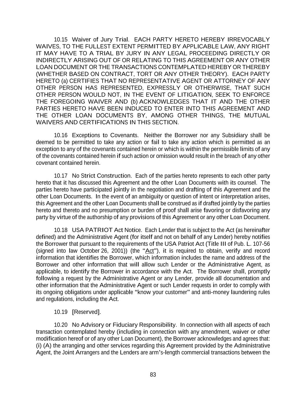 83 10.15 Waiver of Jury Trial. EACH PARTY HERETO HEREBY IRREVOCABLY WAIVES, TO THE FULLEST EXTENT PERMITTED BY APPLICABLE LAW, ANY RIGHT IT MAY HAVE TO A TRIAL BY JURY IN ANY LEGAL PROCEEDING DIRECTLY OR INDIRECTLY ARISING OUT OF OR RELATING TO THIS AGREEMENT OR ANY OTHER LOAN DOCUMENT OR THE TRANSACTIONS CONTEMPLATED HEREBY OR THEREBY (WHETHER BASED ON CONTRACT, TORT OR ANY OTHER THEORY). EACH PARTY HERETO (a) CERTIFIES THAT NO REPRESENTATIVE AGENT OR ATTORNEY OF ANY OTHER PERSON HAS REPRESENTED, EXPRESSLY OR OTHERWISE, THAT SUCH OTHER PERSON WOULD NOT, IN THE EVENT OF LITIGATION, SEEK TO ENFORCE THE FOREGOING WAIVER AND (b) ACKNOWLEDGES THAT IT AND THE OTHER PARTIES HERETO HAVE BEEN INDUCED TO ENTER INTO THIS AGREEMENT AND THE OTHER LOAN DOCUMENTS BY, AMONG OTHER THINGS, THE MUTUAL WAIVERS AND CERTIFICATIONS IN THIS SECTION. 10.16 Exceptions to Covenants. Neither the Borrower nor any Subsidiary shall be deemed to be permitted to take any action or fail to take any action which is permitted as an exception to any of the covenants contained herein or which is within the permissible limits of any of the covenants contained herein if such action or omission would result in the breach of any other covenant contained herein. 10.17 No Strict Construction. Each of the parties hereto represents to each other party hereto that it has discussed this Agreement and the other Loan Documents with its counsel. The parties hereto have participated jointly in the negotiation and drafting of this Agreement and the other Loan Documents. In the event of an ambiguity or question of intent or interpretation arises, this Agreement and the other Loan Documents shall be construed as if drafted jointly by the parties hereto and thereto and no presumption or burden of proof shall arise favoring or disfavoring any party by virtue of the authorship of any provisions of this Agreement or any other Loan Document. 10.18 USA PATRIOT Act Notice. Each Lender that is subject to the Act (as hereinafter defined) and the Administrative Agent (for itself and not on behalf of any Lender) hereby notifies the Borrower that pursuant to the requirements of the USA Patriot Act (Title III of Pub. L. 107-56 (signed into law October 26, 2001)) (the “Act”), it is required to obtain, verify and record information that identifies the Borrower, which information includes the name and address of the Borrower and other information that will allow such Lender or the Administrative Agent, as applicable, to identify the Borrower in accordance with the Act. The Borrower shall, promptly following a request by the Administrative Agent or any Lender, provide all documentation and other information that the Administrative Agent or such Lender requests in order to comply with its ongoing obligations under applicable “know your customer” and anti-money laundering rules and regulations, including the Act. 10.19 [Reserved]. 10.20 No Advisory or Fiduciary Responsibility. In connection with all aspects of each transaction contemplated hereby (including in connection with any amendment, waiver or other modification hereof or of any other Loan Document), the Borrower acknowledges and agrees that: (i) (A) the arranging and other services regarding this Agreement provided by the Administrative Agent, the Joint Arrangers and the Lenders are arm’s-length commercial transactions between the