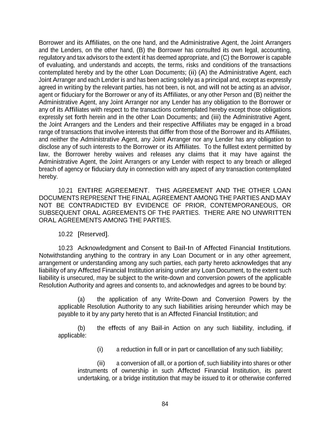 84 Borrower and its Affiliates, on the one hand, and the Administrative Agent, the Joint Arrangers and the Lenders, on the other hand, (B) the Borrower has consulted its own legal, accounting, regulatory and tax advisors to the extent it has deemed appropriate, and (C) the Borrower is capable of evaluating, and understands and accepts, the terms, risks and conditions of the transactions contemplated hereby and by the other Loan Documents; (ii) (A) the Administrative Agent, each Joint Arranger and each Lender is and has been acting solely as a principal and, except as expressly agreed in writing by the relevant parties, has not been, is not, and will not be acting as an advisor, agent or fiduciary for the Borrower or any of its Affiliates, or any other Person and (B) neither the Administrative Agent, any Joint Arranger nor any Lender has any obligation to the Borrower or any of its Affiliates with respect to the transactions contemplated hereby except those obligations expressly set forth herein and in the other Loan Documents; and (iii) the Administrative Agent, the Joint Arrangers and the Lenders and their respective Affiliates may be engaged in a broad range of transactions that involve interests that differ from those of the Borrower and its Affiliates, and neither the Administrative Agent, any Joint Arranger nor any Lender has any obligation to disclose any of such interests to the Borrower or its Affiliates. To the fullest extent permitted by law, the Borrower hereby waives and releases any claims that it may have against the Administrative Agent, the Joint Arrangers or any Lender with respect to any breach or alleged breach of agency or fiduciary duty in connection with any aspect of any transaction contemplated hereby. 10.21 ENTIRE AGREEMENT. THIS AGREEMENT AND THE OTHER LOAN DOCUMENTS REPRESENT THE FINAL AGREEMENT AMONG THE PARTIES AND MAY NOT BE CONTRADICTED BY EVIDENCE OF PRIOR, CONTEMPORANEOUS, OR SUBSEQUENT ORAL AGREEMENTS OF THE PARTIES. THERE ARE NO UNWRITTEN ORAL AGREEMENTS AMONG THE PARTIES. 10.22 [Reserved]. 10.23 Acknowledgment and Consent to Bail-In of Affected Financial Institutions. Notwithstanding anything to the contrary in any Loan Document or in any other agreement, arrangement or understanding among any such parties, each party hereto acknowledges that any liability of any Affected Financial Institution arising under any Loan Document, to the extent such liability is unsecured, may be subject to the write-down and conversion powers of the applicable Resolution Authority and agrees and consents to, and acknowledges and agrees to be bound by: (a) the application of any Write-Down and Conversion Powers by the applicable Resolution Authority to any such liabilities arising hereunder which may be payable to it by any party hereto that is an Affected Financial Institution; and (b) the effects of any Bail-in Action on any such liability, including, if applicable: (i) a reduction in full or in part or cancellation of any such liability; (ii) a conversion of all, or a portion of, such liability into shares or other instruments of ownership in such Affected Financial Institution, its parent undertaking, or a bridge institution that may be issued to it or otherwise conferred