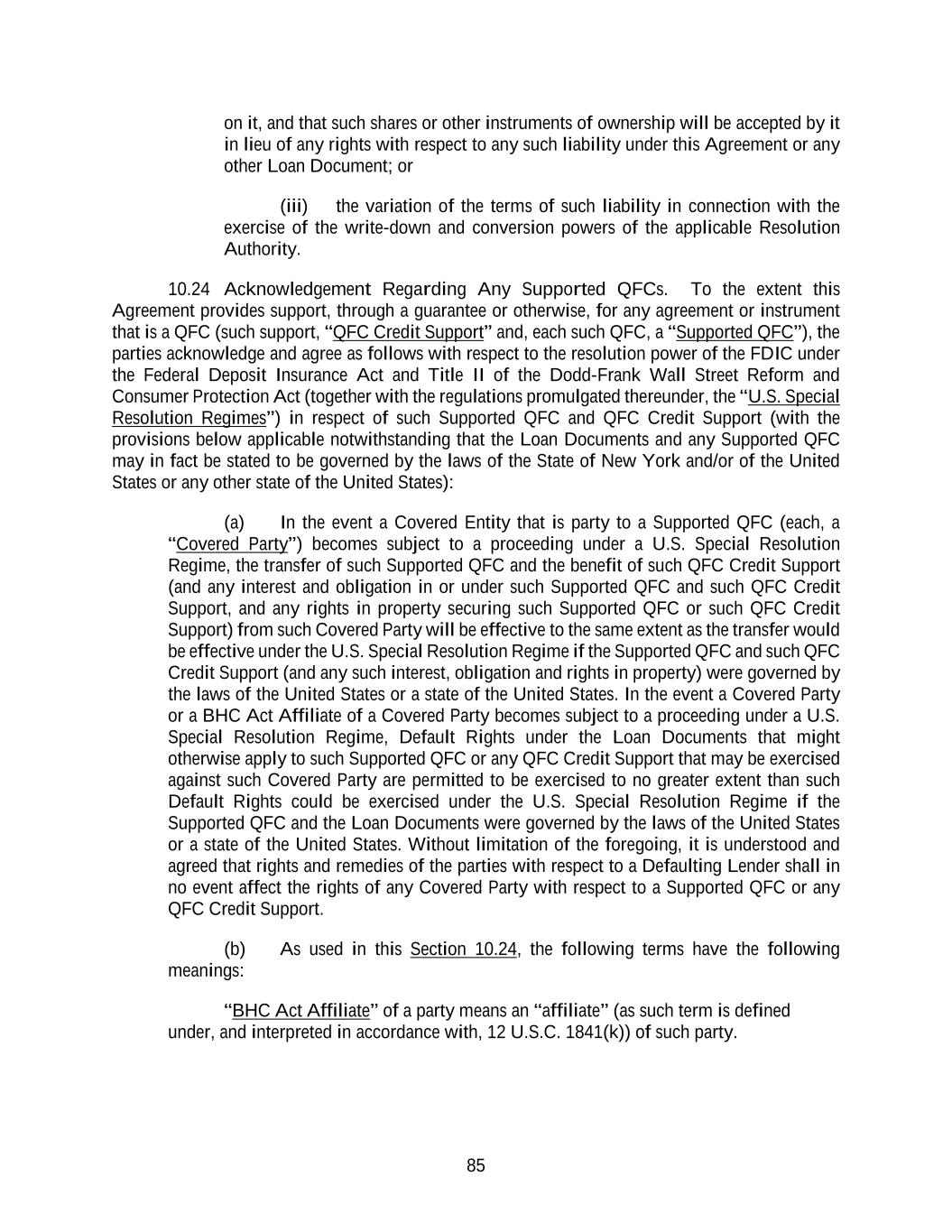 85 on it, and that such shares or other instruments of ownership will be accepted by it in lieu of any rights with respect to any such liability under this Agreement or any other Loan Document; or (iii) the variation of the terms of such liability in connection with the exercise of the write-down and conversion powers of the applicable Resolution Authority. 10.24 Acknowledgement Regarding Any Supported QFCs. To the extent this Agreement provides support, through a guarantee or otherwise, for any agreement or instrument that is a QFC (such support, “QFC Credit Support” and, each such QFC, a “Supported QFC”), the parties acknowledge and agree as follows with respect to the resolution power of the FDIC under the Federal Deposit Insurance Act and Title II of the Dodd-Frank Wall Street Reform and Consumer Protection Act (together with the regulations promulgated thereunder, the “U.S. Special Resolution Regimes”) in respect of such Supported QFC and QFC Credit Support (with the provisions below applicable notwithstanding that the Loan Documents and any Supported QFC may in fact be stated to be governed by the laws of the State of New York and/or of the United States or any other state of the United States): (a) In the event a Covered Entity that is party to a Supported QFC (each, a “Covered Party”) becomes subject to a proceeding under a U.S. Special Resolution Regime, the transfer of such Supported QFC and the benefit of such QFC Credit Support (and any interest and obligation in or under such Supported QFC and such QFC Credit Support, and any rights in property securing such Supported QFC or such QFC Credit Support) from such Covered Party will be effective to the same extent as the transfer would be effective under the U.S. Special Resolution Regime if the Supported QFC and such QFC Credit Support (and any such interest, obligation and rights in property) were governed by the laws of the United States or a state of the United States. In the event a Covered Party or a BHC Act Affiliate of a Covered Party becomes subject to a proceeding under a U.S. Special Resolution Regime, Default Rights under the Loan Documents that might otherwise apply to such Supported QFC or any QFC Credit Support that may be exercised against such Covered Party are permitted to be exercised to no greater extent than such Default Rights could be exercised under the U.S. Special Resolution Regime if the Supported QFC and the Loan Documents were governed by the laws of the United States or a state of the United States. Without limitation of the foregoing, it is understood and agreed that rights and remedies of the parties with respect to a Defaulting Lender shall in no event affect the rights of any Covered Party with respect to a Supported QFC or any QFC Credit Support. (b) As used in this Section 10.24, the following terms have the following meanings: “BHC Act Affiliate” of a party means an “affiliate” (as such term is defined under, and interpreted in accordance with, 12 U.S.C. 1841(k)) of such party.
