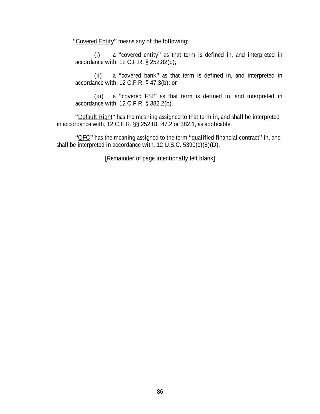 86 “Covered Entity” means any of the following: (i) a “covered entity” as that term is defined in, and interpreted in accordance with, 12 C.F.R. § 252.82(b); (ii) a “covered bank” as that term is defined in, and interpreted in accordance with, 12 C.F.R. § 47.3(b); or (iii) a “covered FSI” as that term is defined in, and interpreted in accordance with, 12 C.F.R. § 382.2(b). “Default Right” has the meaning assigned to that term in, and shall be interpreted in accordance with, 12 C.F.R. §§ 252.81, 47.2 or 382.1, as applicable. “QFC” has the meaning assigned to the term “qualified financial contract” in, and shall be interpreted in accordance with, 12 U.S.C. 5390(c)(8)(D). [Remainder of page intentionally left blank]
