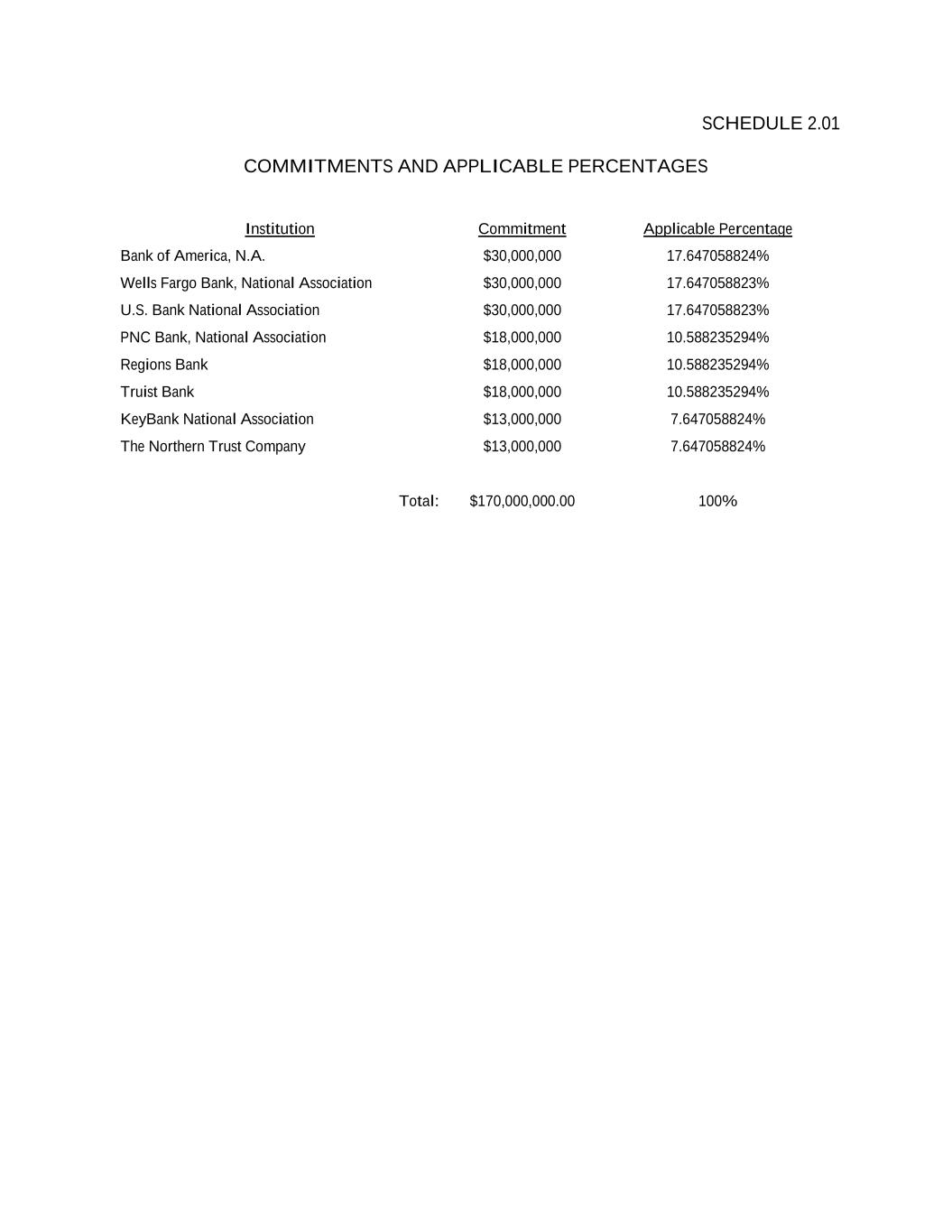 SCHEDULE 2.01 COMMITMENTS AND APPLICABLE PERCENTAGES Institution Commitment Applicable Percentage Bank of America, N.A. $30,000,000 17.647058824% Wells Fargo Bank, National Association $30,000,000 17.647058823% U.S. Bank National Association $30,000,000 17.647058823% PNC Bank, National Association $18,000,000 10.588235294% Regions Bank $18,000,000 10.588235294% Truist Bank $18,000,000 10.588235294% KeyBank National Association $13,000,000 7.647058824% The Northern Trust Company $13,000,000 7.647058824% Total: $170,000,000.00 100%