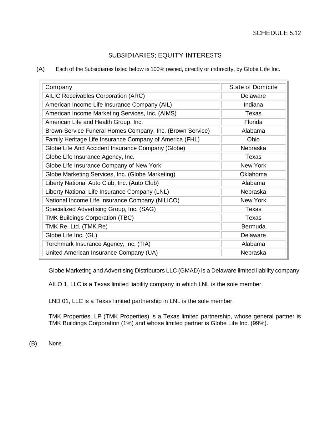SCHEDULE 5.12 SUBSIDIARIES; EQUITY INTERESTS (A) Each of the Subsidiaries listed below is 100% owned, directly or indirectly, by Globe Life Inc. Company State of Domicile AILIC Receivables Corporation (ARC) Delaware American Income Life Insurance Company (AIL) Indiana American Income Marketing Services, Inc. (AIMS) Texas American Life and Health Group, Inc. Florida Brown-Service Funeral Homes Company, Inc. (Brown Service) Alabama Family Heritage Life Insurance Company of America (FHL) Ohio Globe Life And Accident Insurance Company (Globe) Nebraska Globe Life Insurance Agency, Inc. Texas Globe Life Insurance Company of New York New York Globe Marketing Services, Inc. (Globe Marketing) Oklahoma Liberty National Auto Club, Inc. (Auto Club) Alabama Liberty National Life Insurance Company (LNL) Nebraska National Income Life Insurance Company (NILICO) New York Specialized Advertising Group, Inc. (SAG) Texas TMK Buildings Corporation (TBC) Texas TMK Re, Ltd. (TMK Re) Bermuda Globe Life Inc. (GL) Delaware Torchmark Insurance Agency, Inc. (TIA) Alabama United American Insurance Company (UA) Nebraska Globe Marketing and Advertising Distributors LLC (GMAD) is a Delaware limited liability company. AILO 1, LLC is a Texas limited liability company in which LNL is the sole member. LND 01, LLC is a Texas limited partnership in LNL is the sole member. TMK Properties, LP (TMK Properties) is a Texas limited partnership, whose general partner is TMK Buildings Corporation (1%) and whose limited partner is Globe Life Inc. (99%). (B) None.