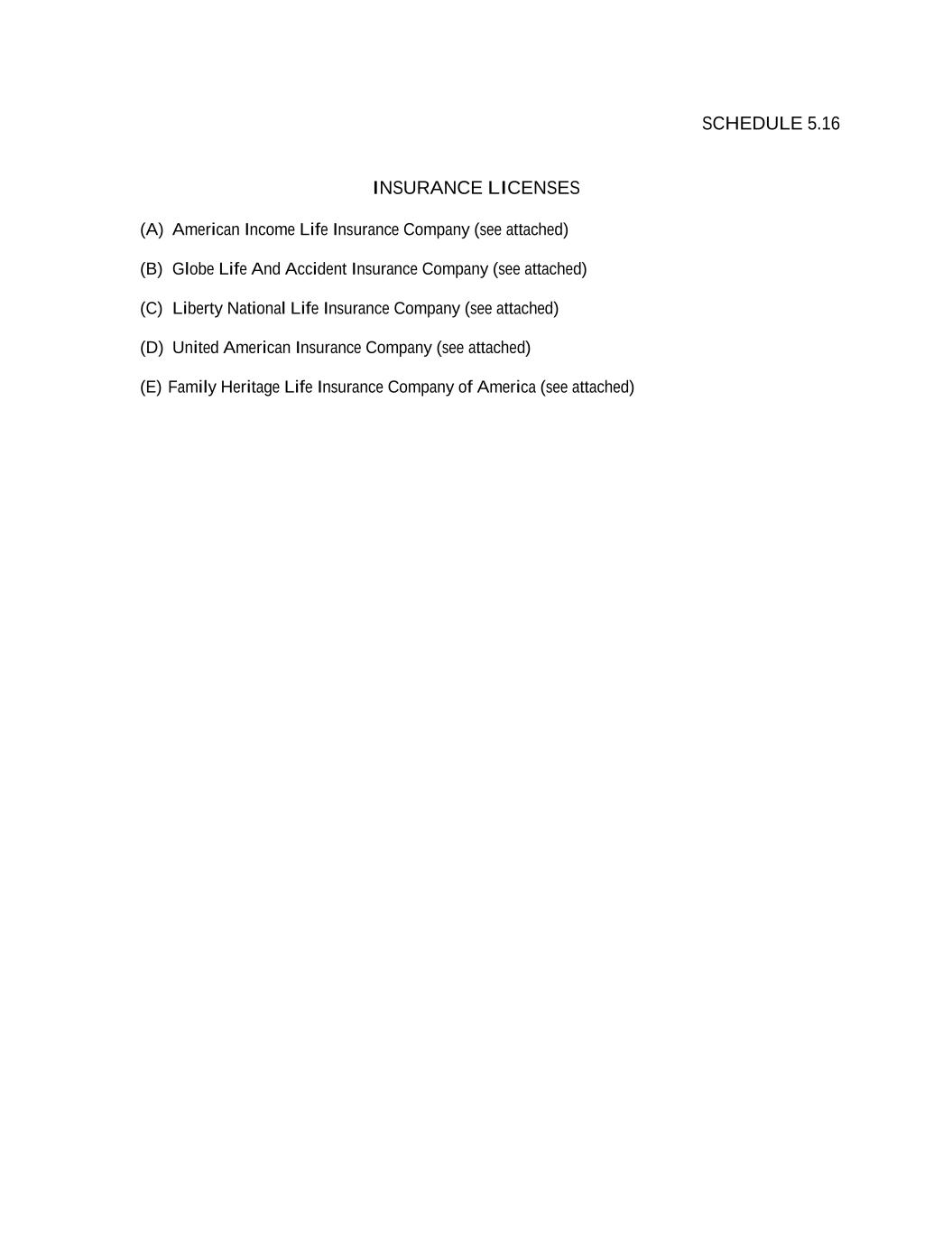 SCHEDULE 5.16 INSURANCE LICENSES (A) American Income Life Insurance Company (see attached) (B) Globe Life And Accident Insurance Company (see attached) (C) Liberty National Life Insurance Company (see attached) (D) United American Insurance Company (see attached) (E) Family Heritage Life Insurance Company of America (see attached)