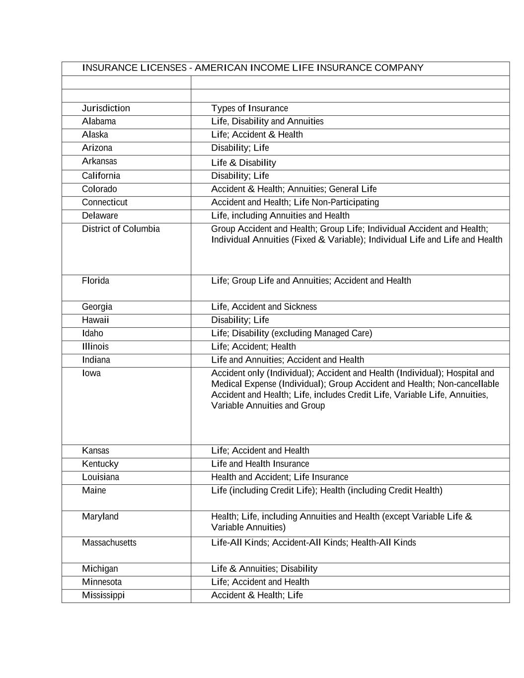 INSURANCE LICENSES - AMERICAN INCOME LIFE INSURANCE COMPANY Jurisdiction Types of Insurance Alabama Life, Disability and Annuities Alaska Life; Accident & Health Arizona Disability; Life Arkansas Life & Disability California Disability; Life Colorado Accident & Health; Annuities; General Life Connecticut Accident and Health; Life Non-Participating Delaware Life, including Annuities and Health District of Columbia Group Accident and Health; Group Life; Individual Accident and Health; Individual Annuities (Fixed & Variable); Individual Life and Life and Health Florida Life; Group Life and Annuities; Accident and Health Georgia Life, Accident and Sickness Hawaii Disability; Life Idaho Life; Disability (excluding Managed Care) Illinois Life; Accident; Health Indiana Life and Annuities; Accident and Health Iowa Accident only (Individual); Accident and Health (Individual); Hospital and Medical Expense (Individual); Group Accident and Health; Non-cancellable Accident and Health; Life, includes Credit Life, Variable Life, Annuities, Variable Annuities and Group Kansas Life; Accident and Health Kentucky Life and Health Insurance Louisiana Health and Accident; Life Insurance Maine Life (including Credit Life); Health (including Credit Health) Maryland Health; Life, including Annuities and Health (except Variable Life & Variable Annuities) Massachusetts Life-All Kinds; Accident-All Kinds; Health-All Kinds Michigan Life & Annuities; Disability Minnesota Life; Accident and Health Mississippi Accident & Health; Life