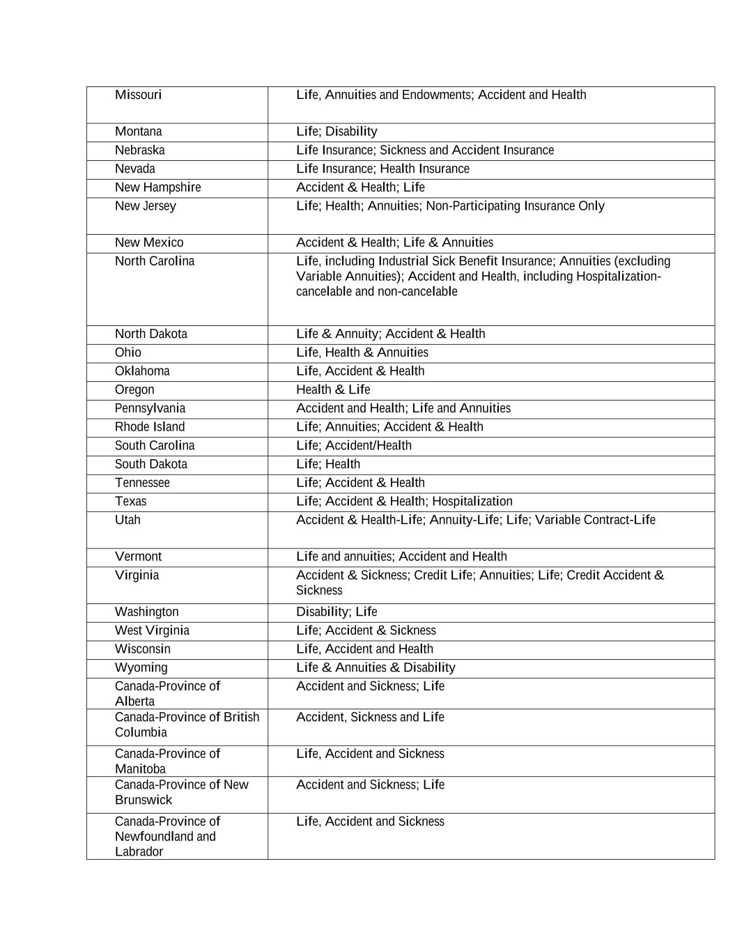 Missouri Life, Annuities and Endowments; Accident and Health Montana Life; Disability Nebraska Life Insurance; Sickness and Accident Insurance Nevada Life Insurance; Health Insurance New Hampshire Accident & Health; Life New Jersey Life; Health; Annuities; Non-Participating Insurance Only New Mexico Accident & Health; Life & Annuities North Carolina Life, including Industrial Sick Benefit Insurance; Annuities (excluding Variable Annuities); Accident and Health, including Hospitalization- cancelable and non-cancelable North Dakota Life & Annuity; Accident & Health Ohio Life, Health & Annuities Oklahoma Life, Accident & Health Oregon Health & Life Pennsylvania Accident and Health; Life and Annuities Rhode Island Life; Annuities; Accident & Health South Carolina Life; Accident/Health South Dakota Life; Health Tennessee Life; Accident & Health Texas Life; Accident & Health; Hospitalization Utah Accident & Health-Life; Annuity-Life; Life; Variable Contract-Life Vermont Life and annuities; Accident and Health Virginia Accident & Sickness; Credit Life; Annuities; Life; Credit Accident & Sickness Washington Disability; Life West Virginia Life; Accident & Sickness Wisconsin Life, Accident and Health Wyoming Life & Annuities & Disability Canada-Province of Alberta Accident and Sickness; Life Canada-Province of British Columbia Accident, Sickness and Life Canada-Province of Manitoba Life, Accident and Sickness Canada-Province of New Brunswick Accident and Sickness; Life Canada-Province of Newfoundland and Labrador Life, Accident and Sickness