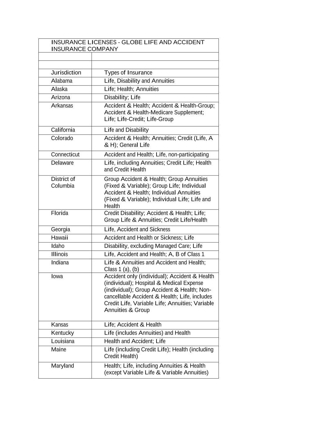 INSURANCE LICENSES - GLOBE LIFE AND ACCIDENT INSURANCE COMPANY Jurisdiction Types of Insurance Alabama Life, Disability and Annuities Alaska Life; Health; Annuities Arizona Disability; Life Arkansas Accident & Health; Accident & Health-Group; Accident & Health-Medicare Supplement; Life; Life-Credit; Life-Group California Life and Disability Colorado Accident & Health; Annuities; Credit (Life, A & H); General Life Connecticut Accident and Health; Life, non-participating Delaware Life, including Annuities; Credit Life; Health and Credit Health District of Columbia Group Accident & Health; Group Annuities (Fixed & Variable); Group Life; Individual Accident & Health; Individual Annuities (Fixed & Variable); Individual Life; Life and Health Florida Credit Disability; Accident & Health; Life; Group Life & Annuities; Credit Life/Health Georgia Life, Accident and Sickness Hawaii Accident and Health or Sickness; Life Idaho Disability, excluding Managed Care; Life Illinois Life, Accident and Health; A, B of Class 1 Indiana Life & Annuities and Accident and Health; Class 1 (a), (b) Iowa Accident only (individual); Accident & Health (individual); Hospital & Medical Expense (individual); Group Accident & Health; Non- cancellable Accident & Health; Life, includes Credit Life, Variable Life; Annuities; Variable Annuities & Group Kansas Life; Accident & Health Kentucky Life (includes Annuities) and Health Louisiana Health and Accident; Life Maine Life (including Credit Life); Health (including Credit Health) Maryland Health; Life, including Annuities & Health (except Variable Life & Variable Annuities)