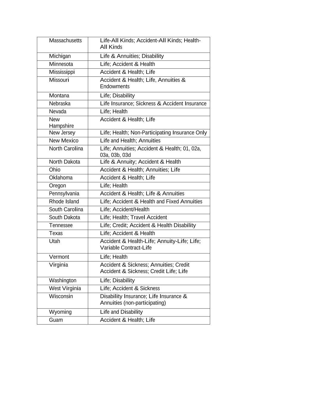 Massachusetts Life-All Kinds; Accident-All Kinds; Health- All Kinds Michigan Life & Annuities; Disability Minnesota Life; Accident & Health Mississippi Accident & Health; Life Missouri Accident & Health; Life, Annuities & Endowments Montana Life; Disability Nebraska Life Insurance; Sickness & Accident Insurance Nevada Life; Health New Hampshire Accident & Health; Life New Jersey Life; Health; Non-Participating Insurance Only New Mexico Life and Health; Annuities North Carolina Life; Annuities; Accident & Health; 01, 02a, 03a, 03b, 03d North Dakota Life & Annuity; Accident & Health Ohio Accident & Health; Annuities; Life Oklahoma Accident & Health; Life Oregon Life; Health Pennsylvania Accident & Health; Life & Annuities Rhode Island Life; Accident & Health and Fixed Annuities South Carolina Life; Accident/Health South Dakota Life; Health; Travel Accident Tennessee Life; Credit; Accident & Health Disability Texas Life; Accident & Health Utah Accident & Health-Life; Annuity-Life; Life; Variable Contract-Life Vermont Life; Health Virginia Accident & Sickness; Annuities; Credit Accident & Sickness; Credit Life; Life Washington Life; Disability West Virginia Life; Accident & Sickness Wisconsin Disability Insurance; Life Insurance & Annuities (non-participating) Wyoming Life and Disability Guam Accident & Health; Life