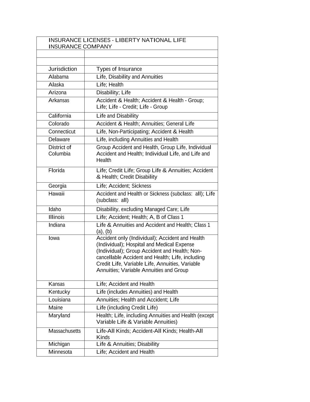 INSURANCE LICENSES - LIBERTY NATIONAL LIFE INSURANCE COMPANY Jurisdiction Types of Insurance Alabama Life, Disability and Annuities Alaska Life; Health Arizona Disability; Life Arkansas Accident & Health; Accident & Health - Group; Life; Life - Credit; Life - Group California Life and Disability Colorado Accident & Health; Annuities; General Life Connecticut Life, Non-Participating; Accident & Health Delaware Life, including Annuities and Health District of Columbia Group Accident and Health, Group Life, Individual Accident and Health; Individual Life, and Life and Health Florida Life; Credit Life; Group Life & Annuities; Accident & Health; Credit Disability Georgia Life; Accident; Sickness Hawaii Accident and Health or Sickness (subclass: all); Life (subclass: all) Idaho Disability, excluding Managed Care; Life Illinois Life; Accident; Health; A, B of Class 1 Indiana Life & Annuities and Accident and Health; Class 1 (a), (b) Iowa Accident only (Individual); Accident and Health (Individual); Hospital and Medical Expense (Individual); Group Accident and Health; Non- cancellable Accident and Health; Life, including Credit Life, Variable Life, Annuities, Variable Annuities; Variable Annuities and Group Kansas Life; Accident and Health Kentucky Life (includes Annuities) and Health Louisiana Annuities; Health and Accident; Life Maine Life (including Credit Life) Maryland Health; Life, including Annuities and Health (except Variable Life & Variable Annuities) Massachusetts Life-All Kinds; Accident-All Kinds; Health-All Kinds Michigan Life & Annuities; Disability Minnesota Life; Accident and Health